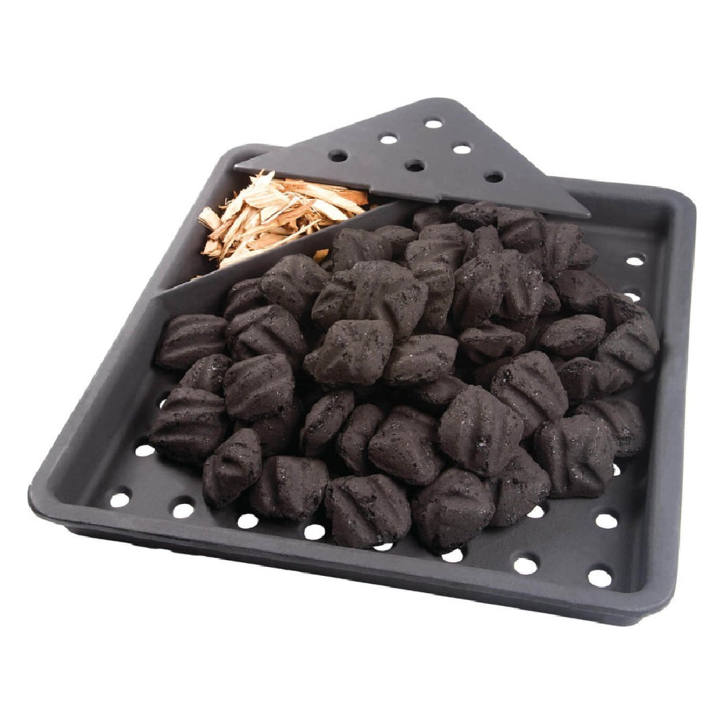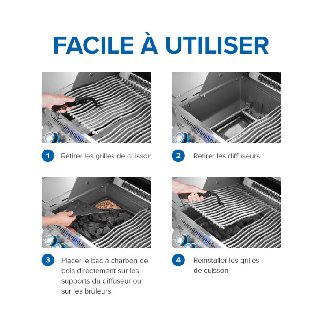 Jumelez la saveur du charbon de bois et de vos copeaux de bois préférés à votre gril à gaz. Le charbon de bois s’allume facilement et rapidement avec vos brûleurs de cuve. Il suffit d'enlever vos grilles et les plaques de brûleur, de déposer le bac à charbon de bois sur les brûleurs, d'ajouter du charbon de bois et de remettre les grilles de cuisson en place.