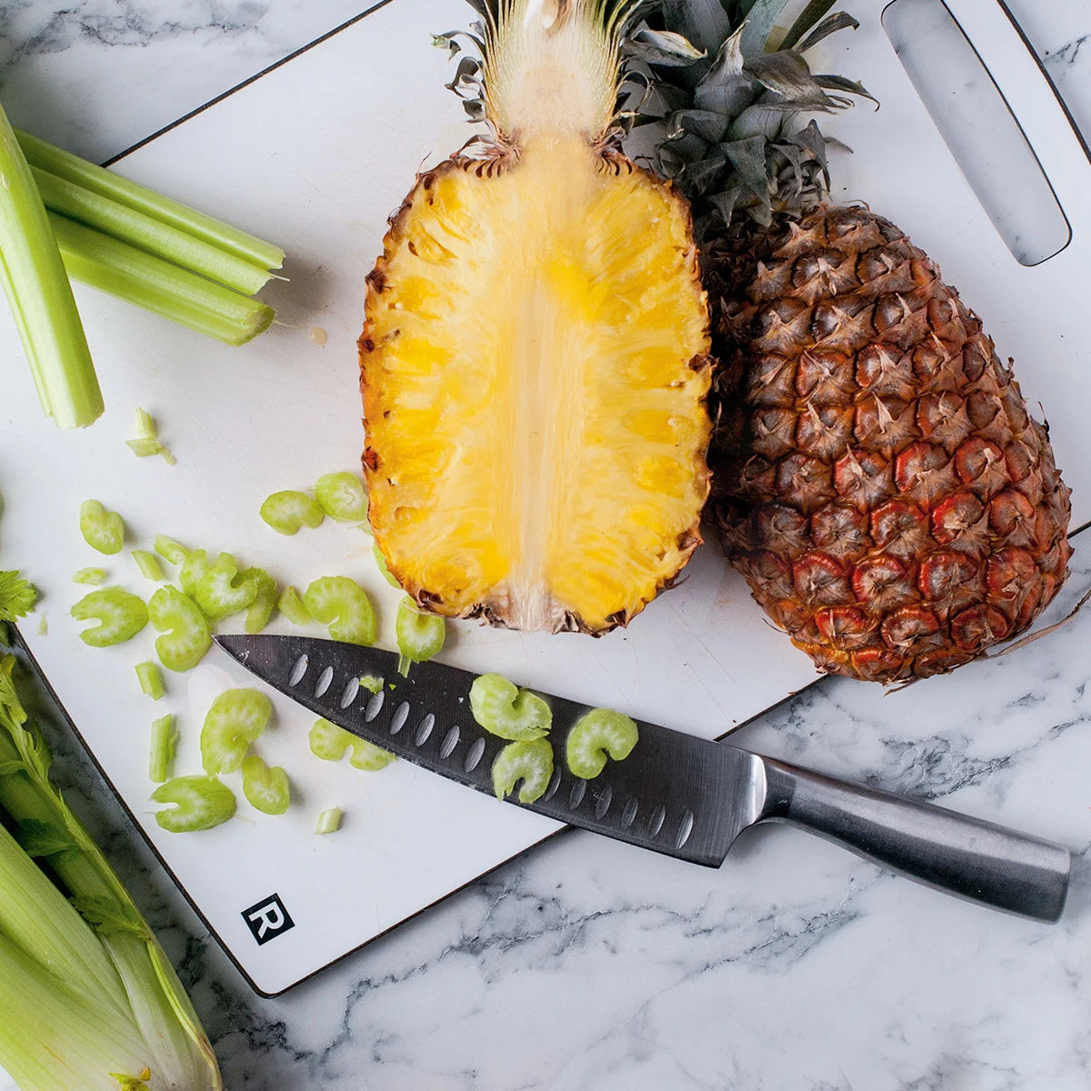 - Lame de 20 cm (8") : format polyvalent pour trancher, hacher et émincer.