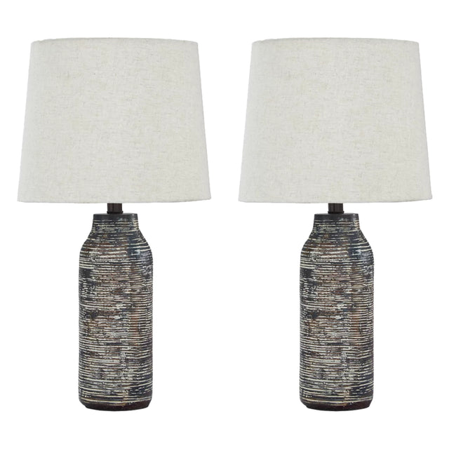 L’ensemble de 2 lampes de table Mahima L235584 de Ashley allie style urbain et élégance texturée pour un effet visuel unique. Leur base en papier composite noir et blanc, à la finition légèrement usée, évoque le charme industriel tout en conservant une touche moderne et raffinée.