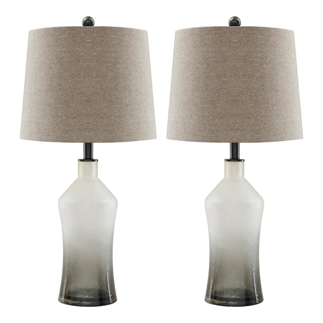 L’ensemble de 2 lampes de table Nollie L430534 de Ashley marie subtilement élégance artistique et modernité. Leur base en verre d’art gris dépoli évoque une ambiance brumeuse et apaisante, tandis que le fleuron noir mat et l’abat-jour gris tambour ajoutent une touche de sophistication contemporaine.