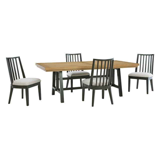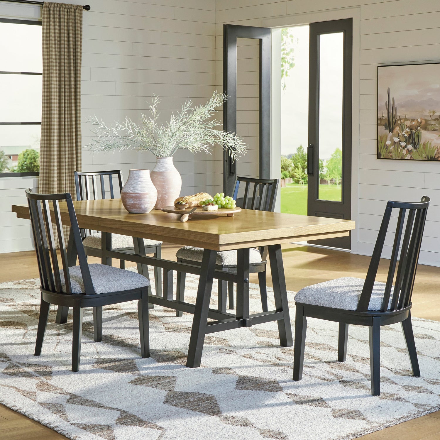 L’ensemble de salle à manger Galliden D841-55/01X4 de Ashley a une table à tréteaux rectangulaire, avec sa base noire vieillie et son plateau en chêne naturel, offre un charme rustique irrésistible. Sa conception robuste, fabriquée en bois massif avec un placage en chêne épais, garantit durabilité et caractère. Dotée de deux rallonges amovibles, cette table peut accueillir jusqu’à 10 personnes, idéale pour les grandes réceptions comme les repas en famille. Les chaises assorties, au dossier courbé et au siège rembourré en tissu texturé, complètent cet ensemble avec une élégance sobre et confortable.