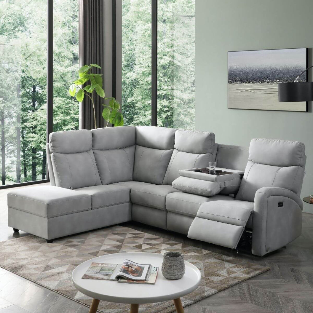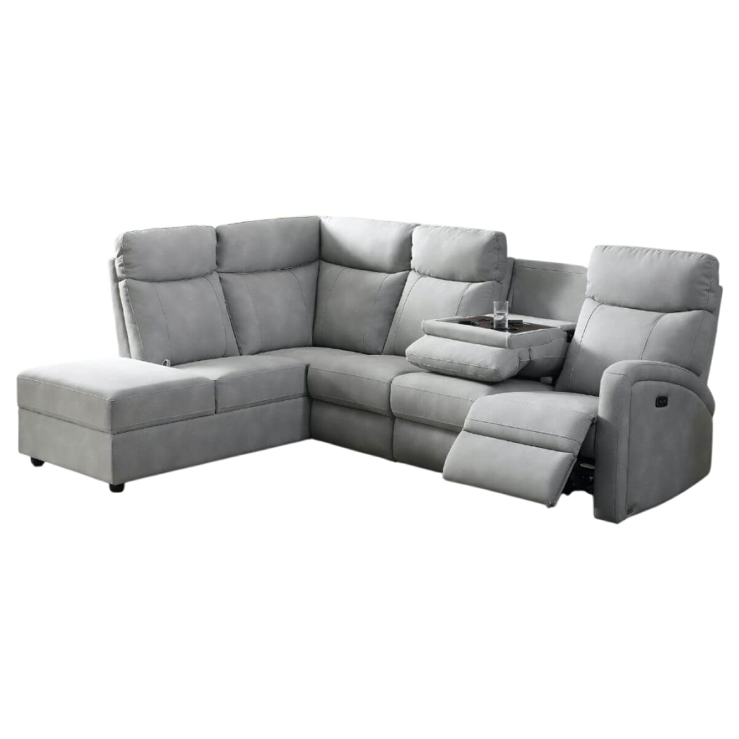 Sectionnel motorisé en tissu gris pâle avec table rabattable & chaise longue - Bordeaux