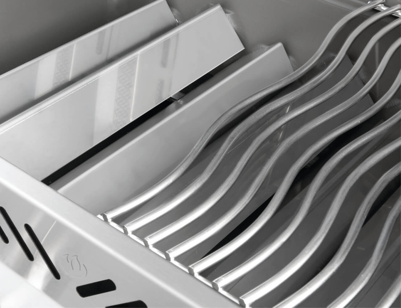 - Grilles de cuisson Waveᴹᴰ en acier inoxydable de 9,5 mm, emblématiques pour leur design et durabilité.