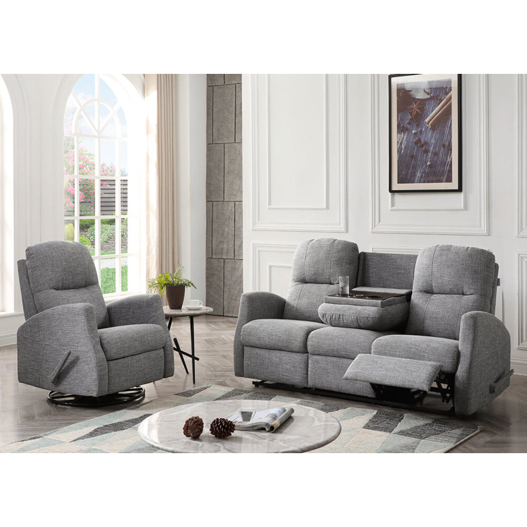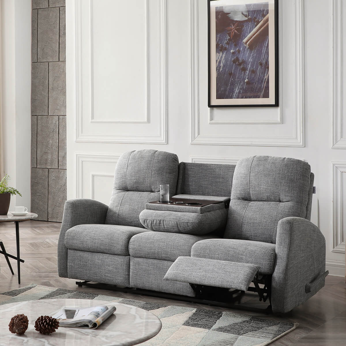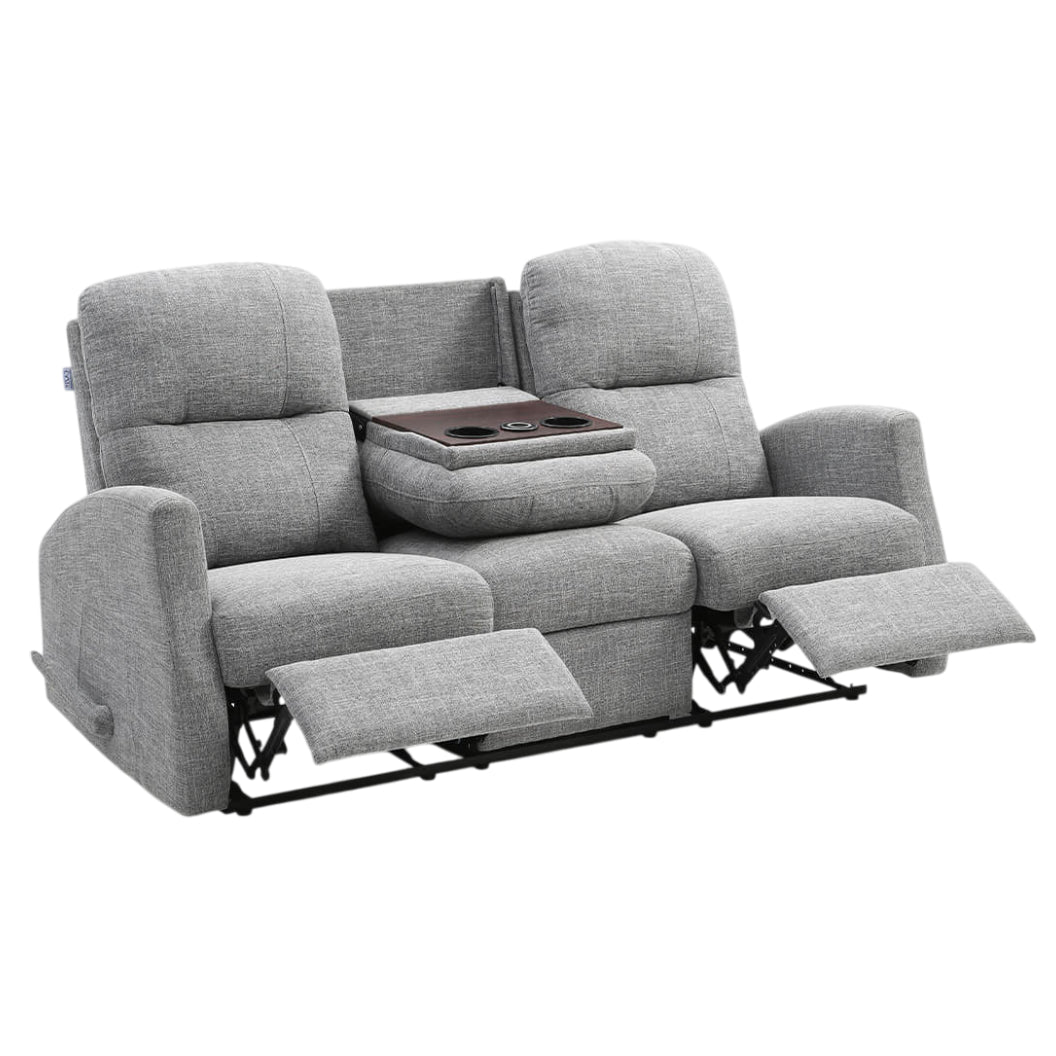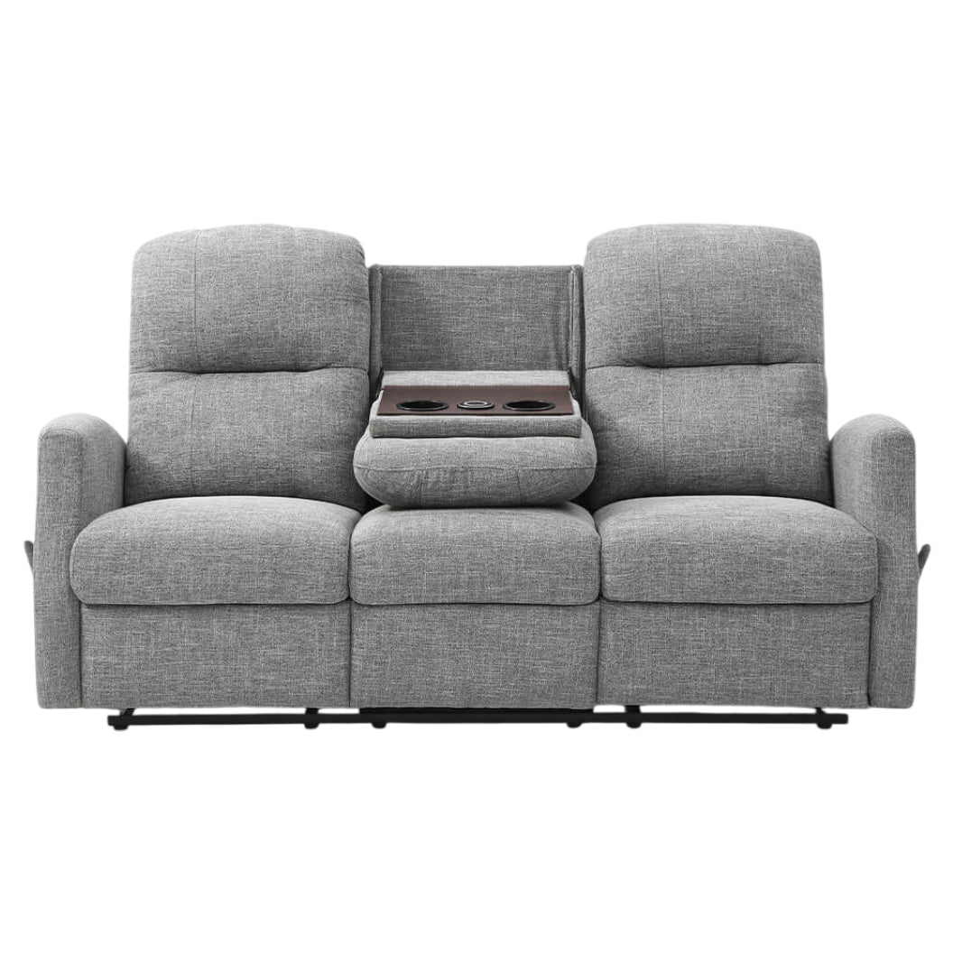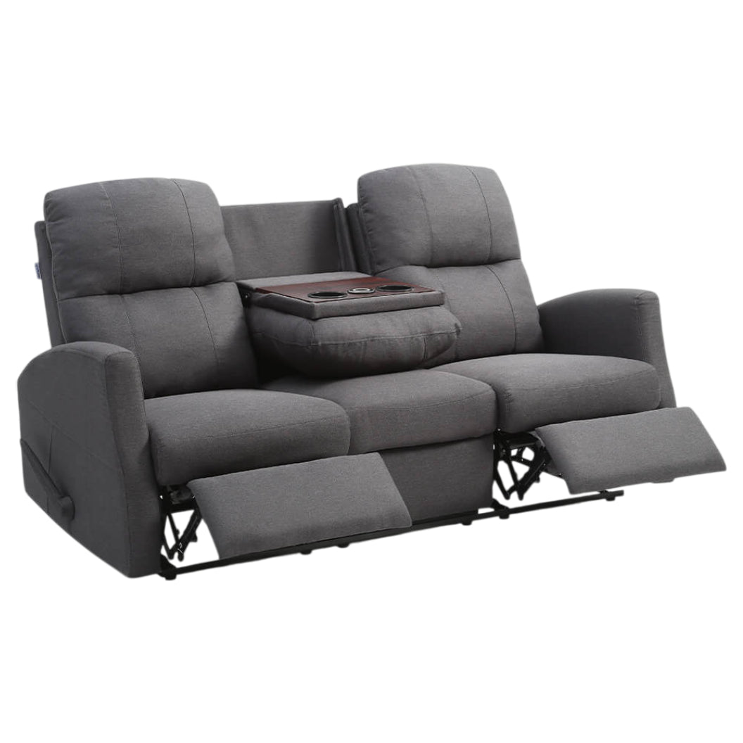 Le sofa inclinable manuel 3 places Athènes 8104-3P de Azur est conçu pour offrir un confort ergonomique aux personnes de plus petite taille grâce à son assise courte, permettant d’avoir les pieds bien appuyés au sol pour une posture naturelle. Son tissu en deux couleurs (gris ou gris foncé) s’intègre aisément à des décors contemporains ou classiques. La table à café centrale ajoute une praticité immédiate pour les collations et l’usage quotidien des appareils, grâce à son chargeur sans fil intégré. L’ensemble repose sur une structure en bois franc et contreplaqué, associée à des ressorts ensachés pour un soutien durable, ce qui en fait un sofa inclinable manuel à la fois fonctionnel et conçu pour durer.