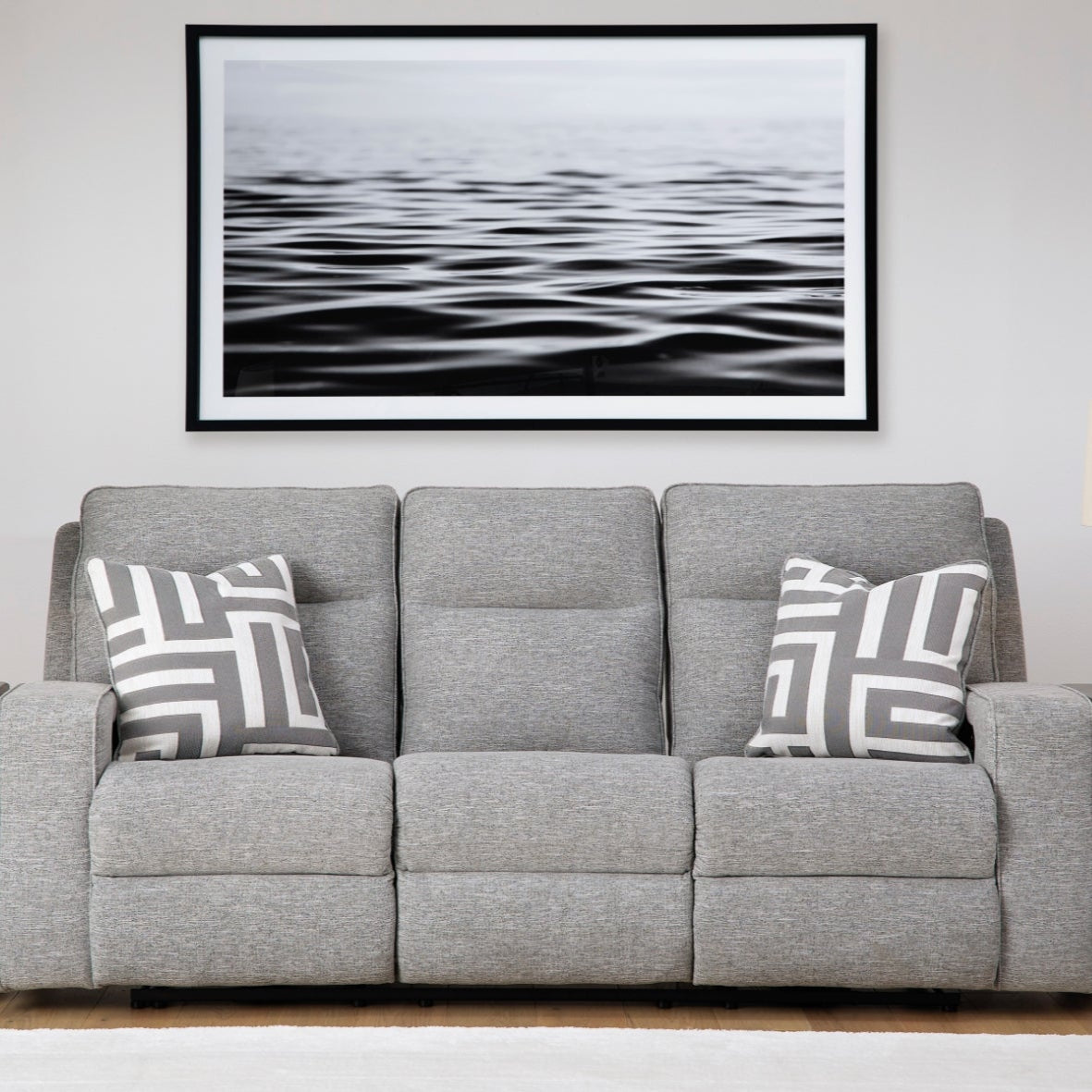 Sofa motorisé en tissu gris pâle avec coussins - Biscoe