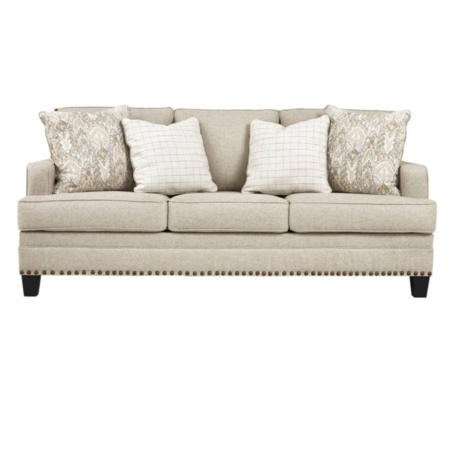 Ce canapé Claredon 1560238 de Ashley incarne une fusion harmonieuse de styles contemporain et traditionnel, parfaitement adaptée à une esthétique de ferme moderne revisitée. Son revêtement en lin tissé beige, ses accoudoirs en retrait enveloppés de coussins en T, et sa garniture cloutée en font une pièce à la fois raffinée et accueillante. Les coussins décoratifs aux teintes douces viennent compléter l'ensemble avec subtilité et sophistication, créant un mobilier aussi esthétique que confortable.