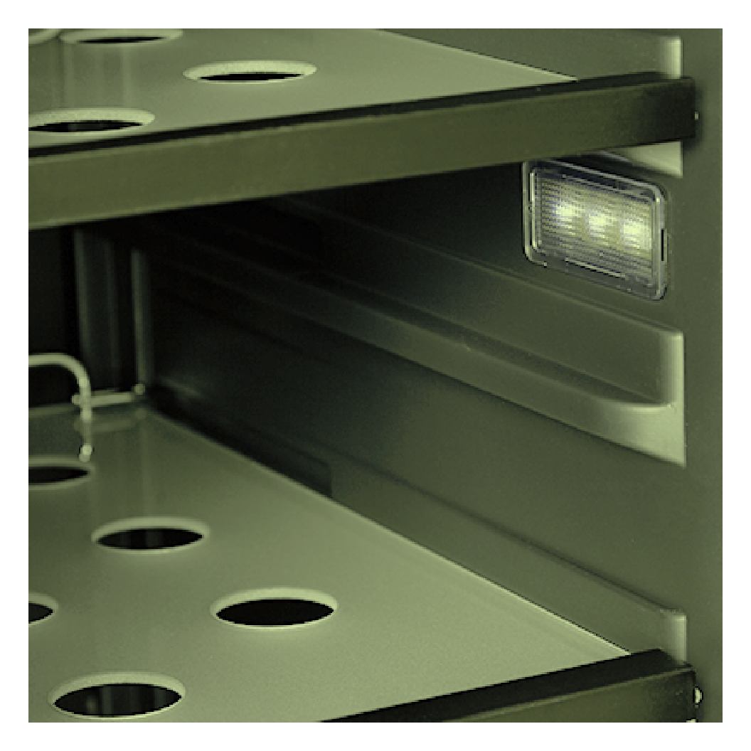 - Six supports métalliques et trois tablettes de verre facilitant l’organisation des bouteilles et des canettes.