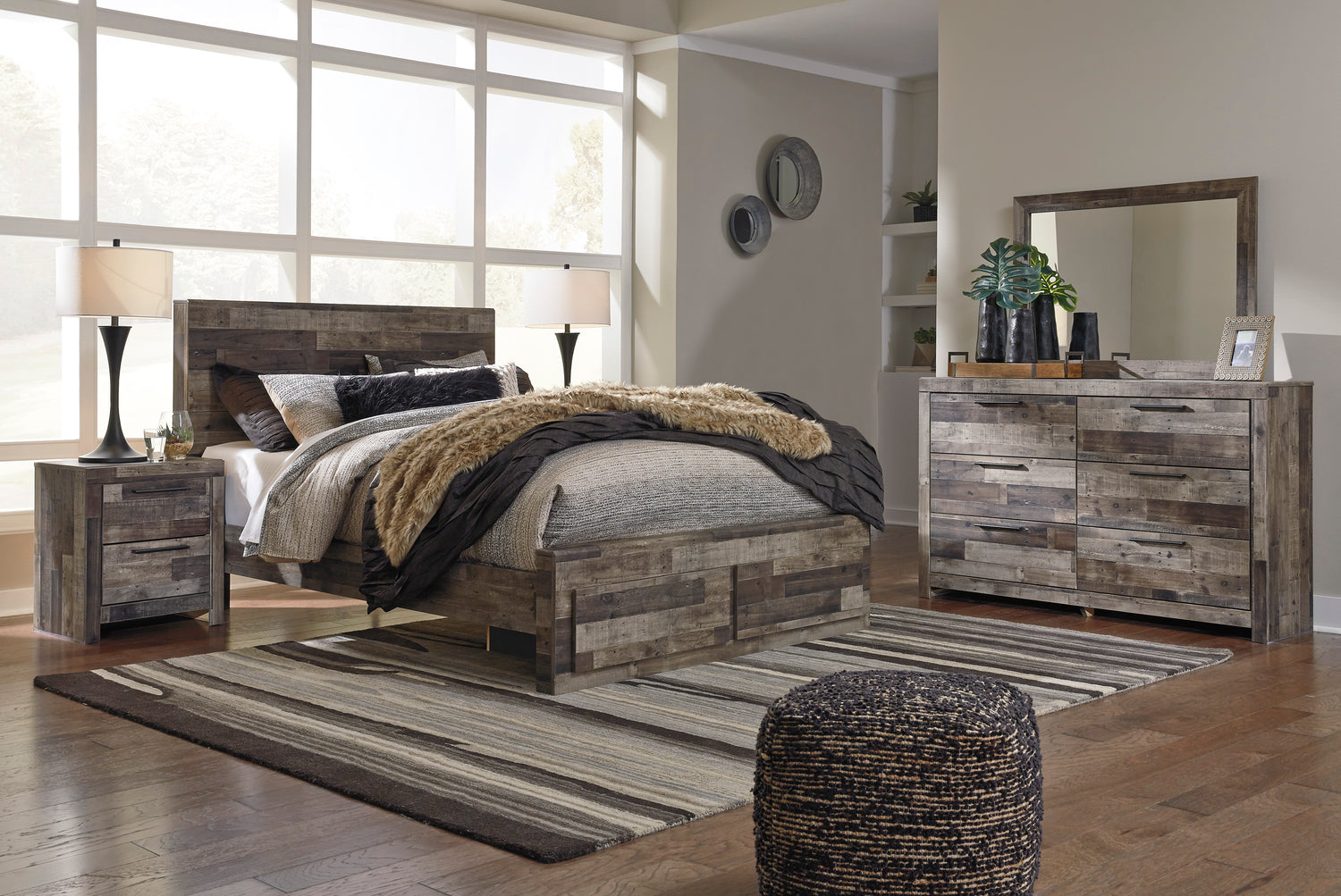 Moderne et pourtant imposante, ce bureau affiche une allure urbaine et éclectique. L'aspect bois brut vieilli se marie parfaitement avec le design épuré que nous aimons tant aujourd'hui. Une finition rustique discrète sur un veinage de pin reproduit préserve son authenticité. Les tiroirs spacieux sont flanqués d'une façade encadrée et de pilastres attrayants.