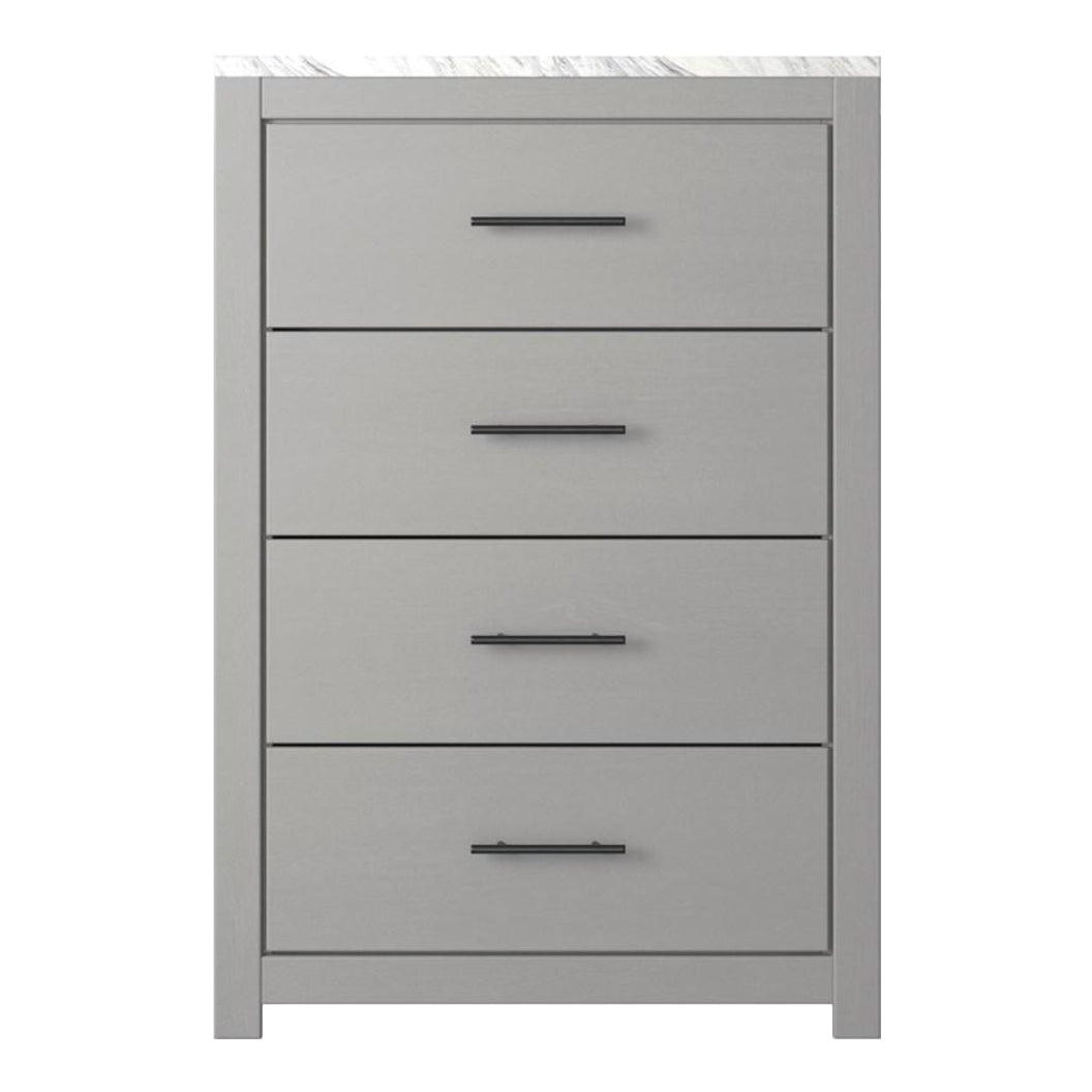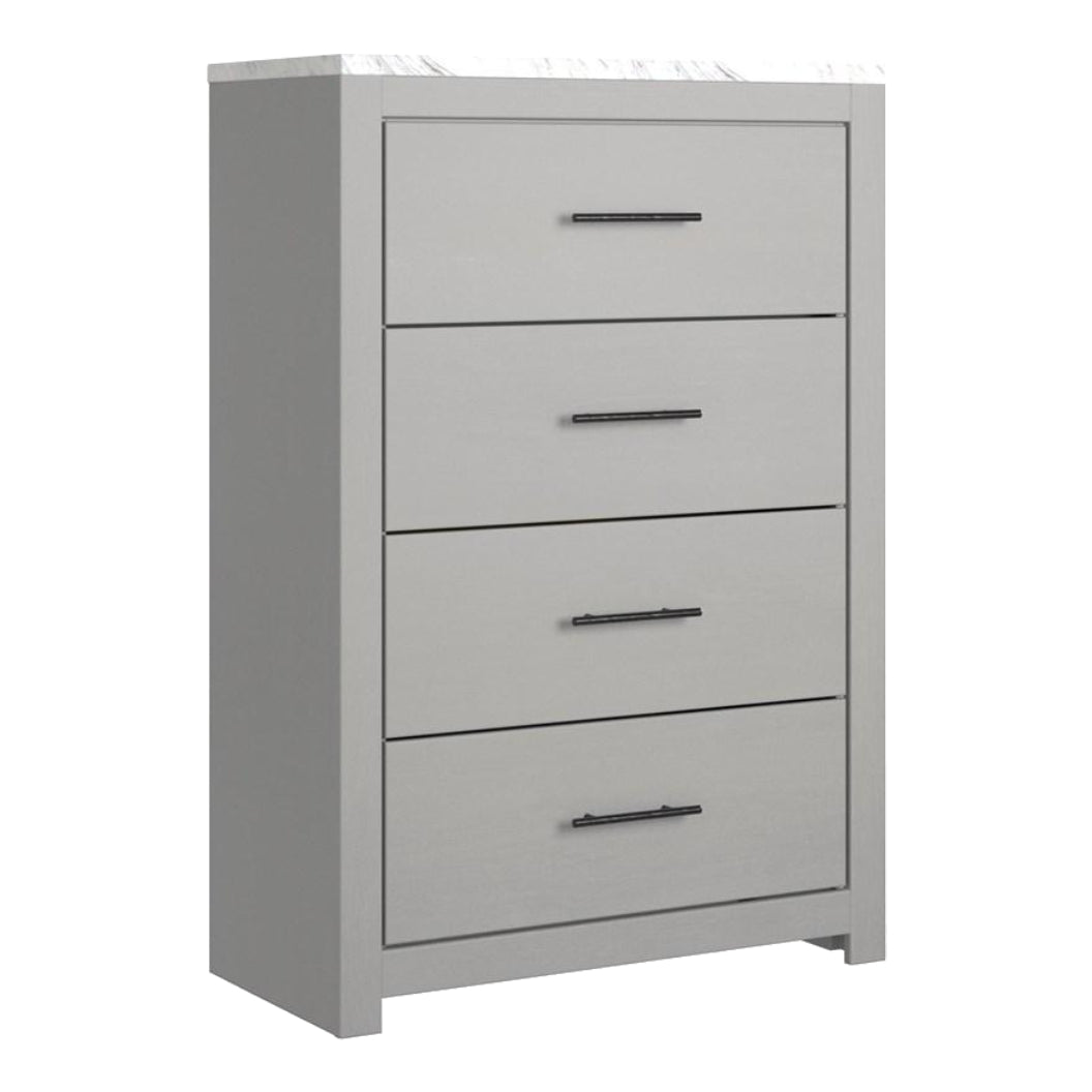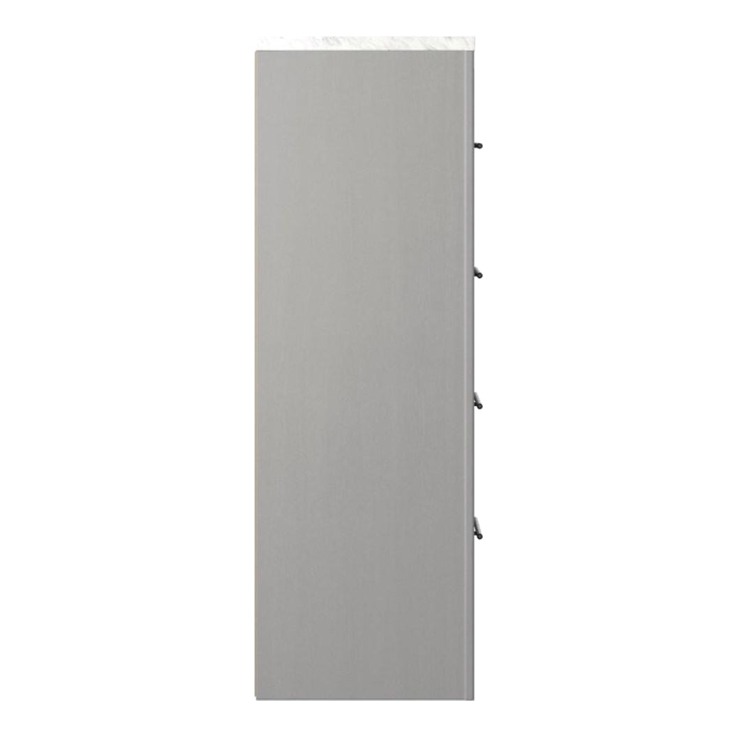 Le fini gris tourterelle vaporeux de ce coffre et son plateau en faux marbre Calcutta donnent le ton à votre sanctuaire apaisant. Les grandes poignées linéaires ajoutent de la dimension et de l'authenticité. Quatre tiroirs coulissants s'adaptent parfaitement aux besoins de votre garde-robe.