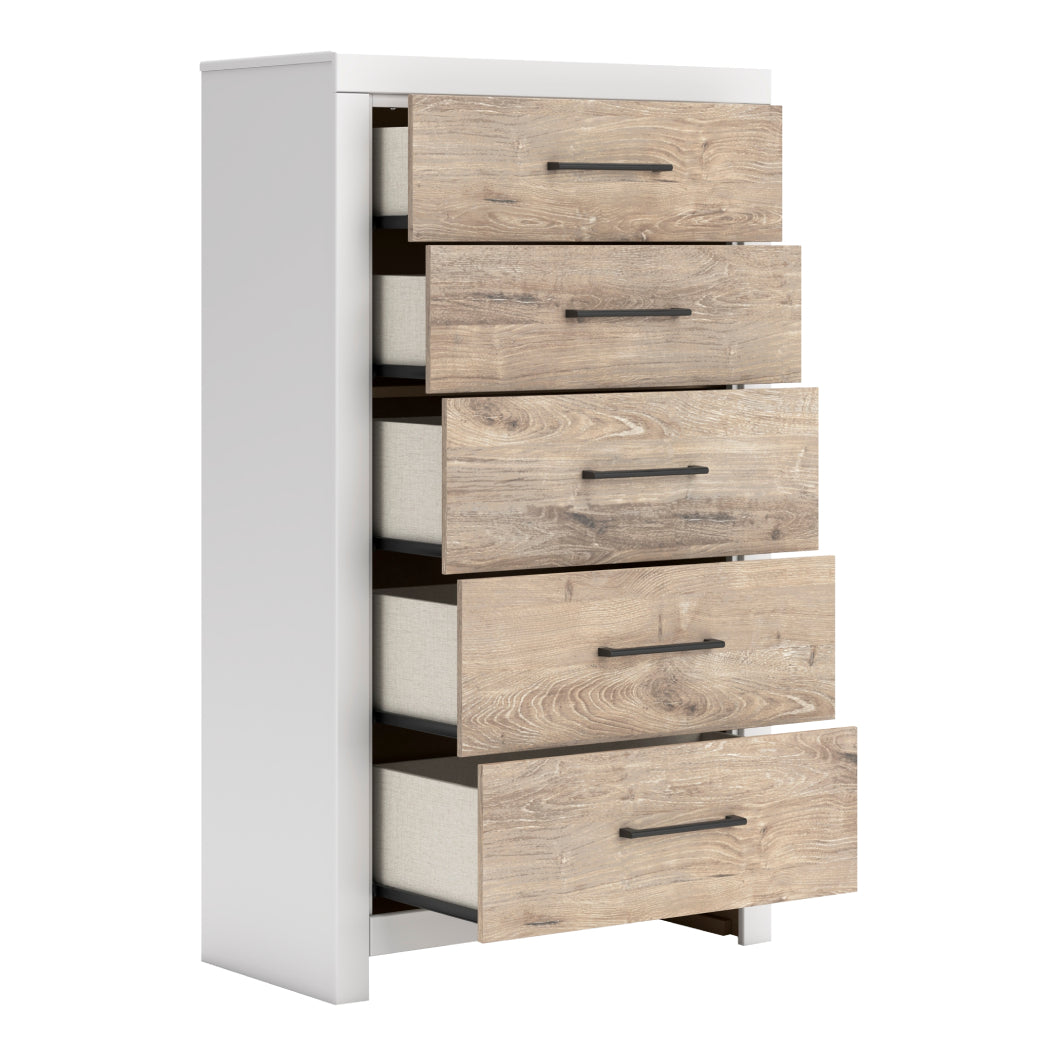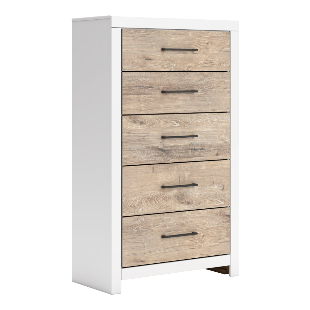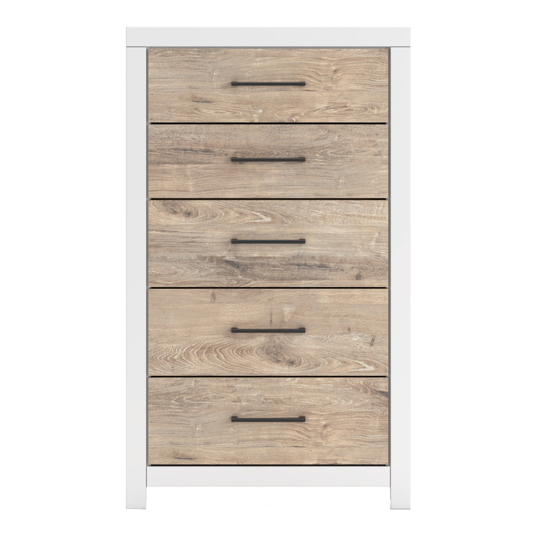 La commode Charbitt B2035-46 de Ashley allie fonctionnalité et style décontracté moderne. Son design bicolore met en valeur un grain de chêne frais reproduit contrasté par une finition blanche mate, créant un look raffiné et intemporel. Avec ses cinq tiroirs spacieux, elle offre un vaste espace de rangement pour organiser vêtements, accessoires et linge de lit. Les poignées élégantes au fini bronze vieilli complètent son allure contemporaine et apportent une touche subtile de sophistication.