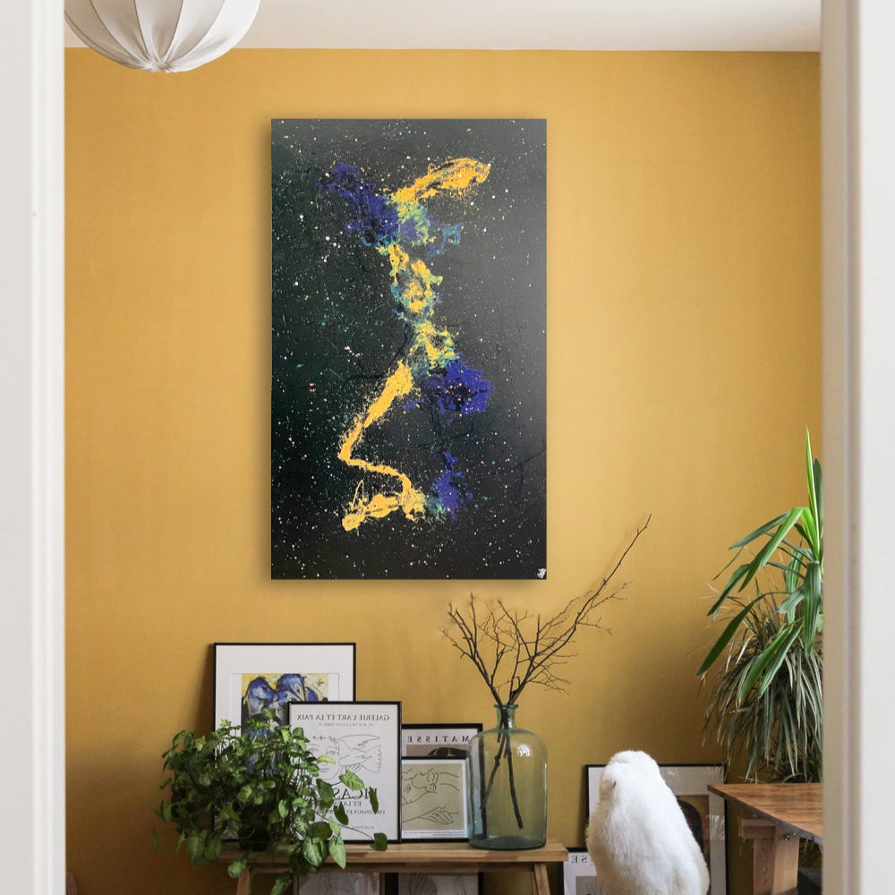 Offerte exclusivement en magasin, la toile Galaxie est une œuvre captivante signée Valérie “VaVa” Rochette. Cette toile évoque l’immensité de l’univers à travers un fond noir profond ponctué d’éclats colorés, comme autant d’étoiles et de nébuleuses. Grâce à sa technique mixte et sa composition verticale imposante, elle insuffle une dimension spatiale et poétique à tout espace intérieur.