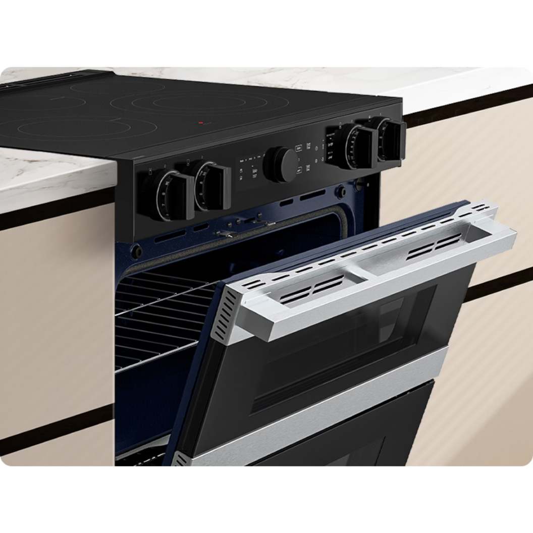 La cuisinière électrique encastrable à deux portes Samsung NSE6DG8550SRAC combine polyvalence et maîtrise de la cuisson grâce au système Flex Duo™ à porte double : deux cavités qui fonctionnent indépendamment pour adapter température et temps selon les plats, ou un seul grand four pour les pièces volumineuses. Les boutons éclairés assurent un contrôle intuitif et une confirmation visuelle immédiate. Le design plat avec poignée encastrée s’intègre discrètement dans les cuisines modernes, tandis que la finition résistante aux empreintes facilite l’entretien. L’interface LCD 2,25" simplifie les réglages, et la connectivité Wi-Fi (SmartThings) offre suivi, commandes à distance et compatibilité Bixby/Alexa/Google Assistant pour plus de commodité au quotidien.