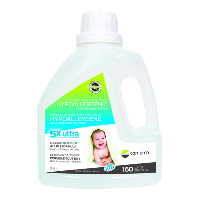 Offrez à vos vêtements un nettoyage en profondeur tout en douceur grâce au détergent hypoallergénique Comerco®. Conçu pour les peaux sensibles, ce détergent sans parfum, sans colorant ni phosphate respecte la peau tout en assurant un lavage complet et performant. Sa formule super concentrée permet jusqu’à 160 brassées avec un format de 2,5 L, tout en nettoyant, adoucissant et blanchissant les tissus. Idéal pour les vêtements délicats, les articles de bébé et les couches lavables, ce détergent HE (haute efficacité) s’adapte à tous les types de laveuses.