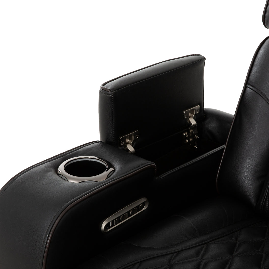 Chaque accoudoir intègre un porte-gobelet et un compartiment dissimulé, parfaits pour garder télécommandes, chargeurs et accessoires à portée de main. -