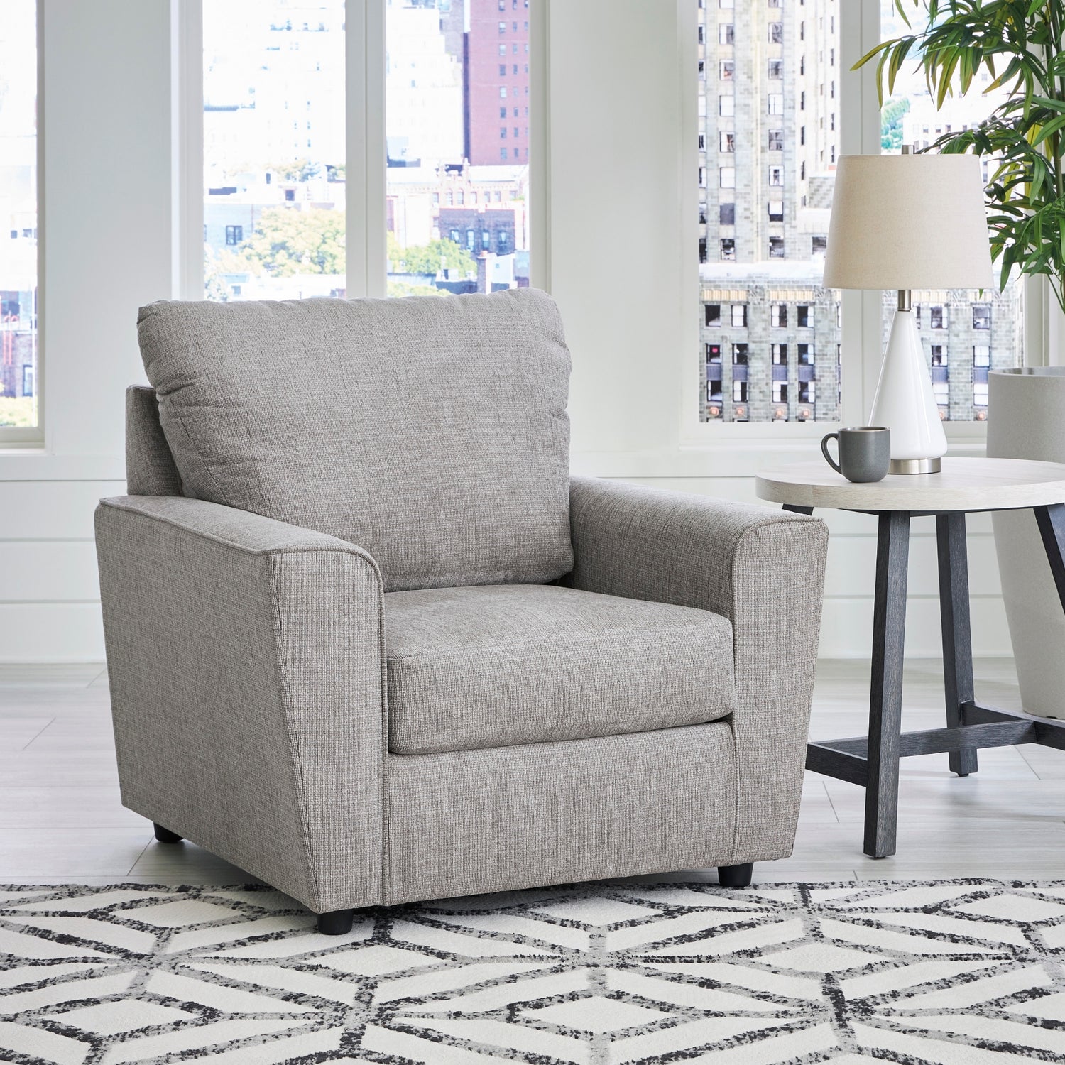La chaise Stairatt met à l’honneur l’élégance des tons gris avec une approche contemporaine et accessible. Son revêtement en chenille moelleuse et ses lignes épurées en font un choix polyvalent pour un salon raffiné. Grâce à ses accoudoirs évasés distinctifs et à sa construction robuste, elle offre un confort durable, aussi agréable à regarder qu’à utiliser.