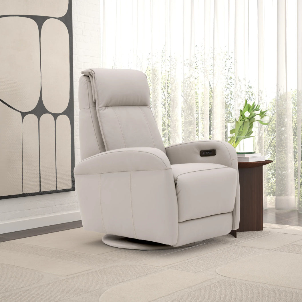 Le fauteuil pivote, berce et s’incline électriquement pour offrir une expérience de détente complète. -