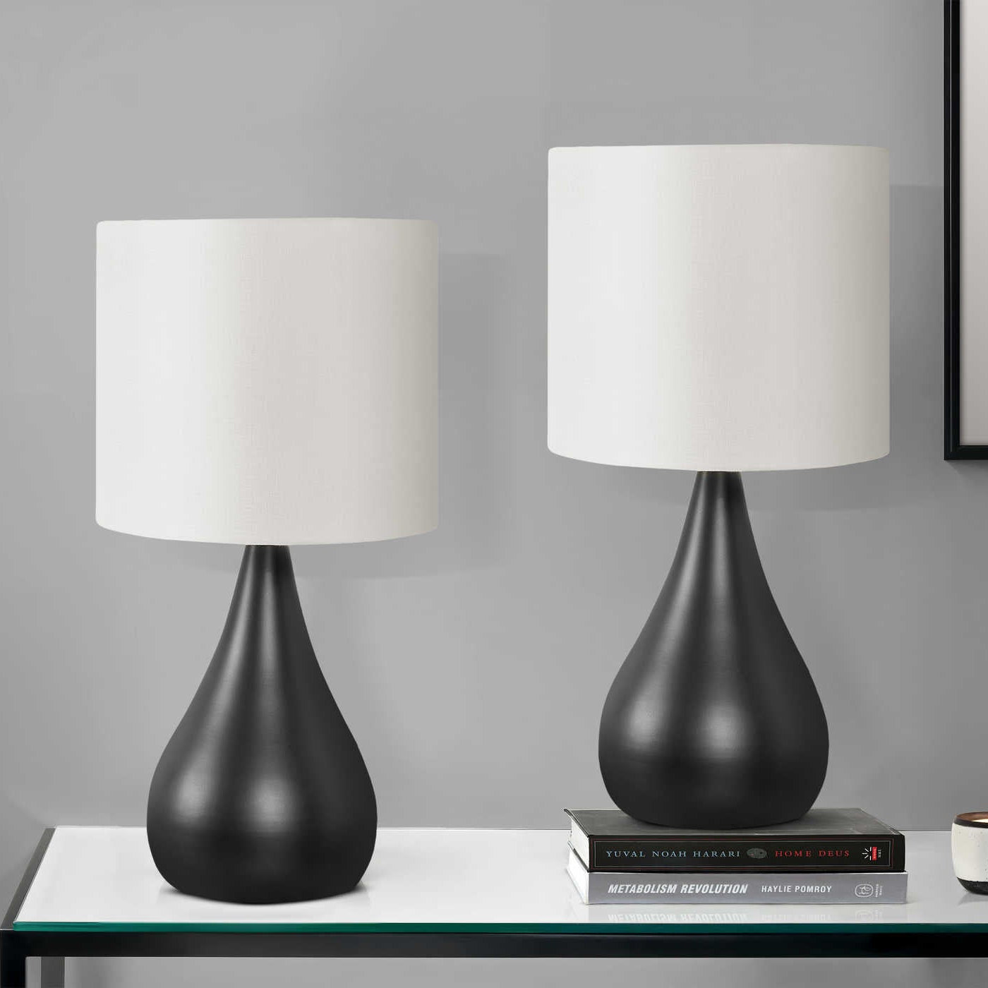 L'ensemble de deux lampes de table de 18 pouces ont une base en métal noir, façonnée en forme de goutte d’eau, apporte une silhouette fluide et contemporaine qui s’intègre facilement à différents styles d’intérieur. Les abat-jour tambour en lin ivoire diffusent une lumière douce et chaleureuse. Pensé pour une utilisation en duo, cet ensemble est parfaitement adapté à de multiples endroite, offrant une harmonie visuelle et une touche décorative cohérente.