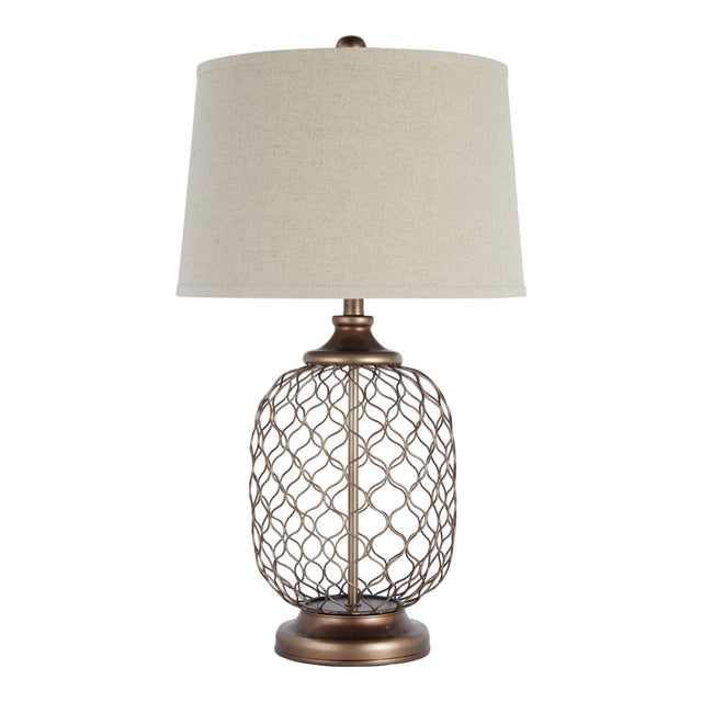 La lampe de table Sanzia L207824 de Ashley séduit par son design moderne et son allure raffinée. Son piètement ajouré en treillis métallique crée un jeu de transparence élégant, tandis que sa finition métallique reflète subtilement la lumière, ajoutant une touche de sophistication à tout espace. Grâce à son abat-jour texturé aux teintes neutres, elle s’intègre aisément à différents styles d’intérieur, du contemporain au classique.