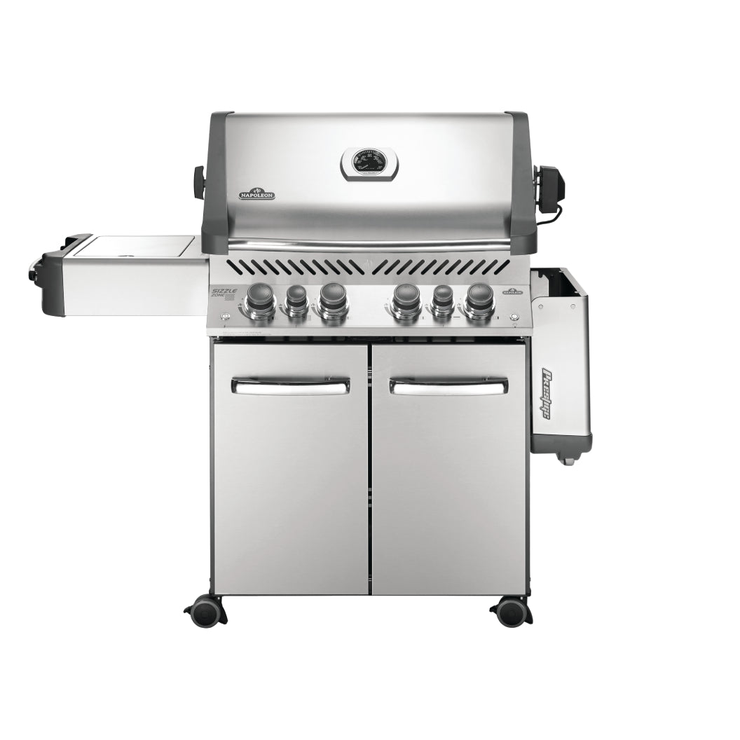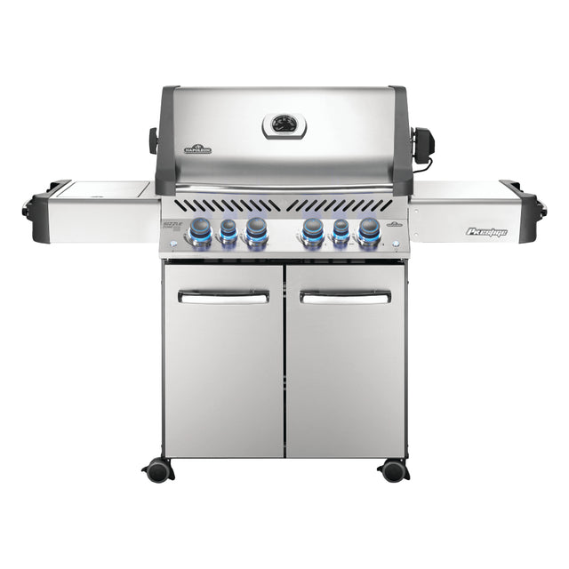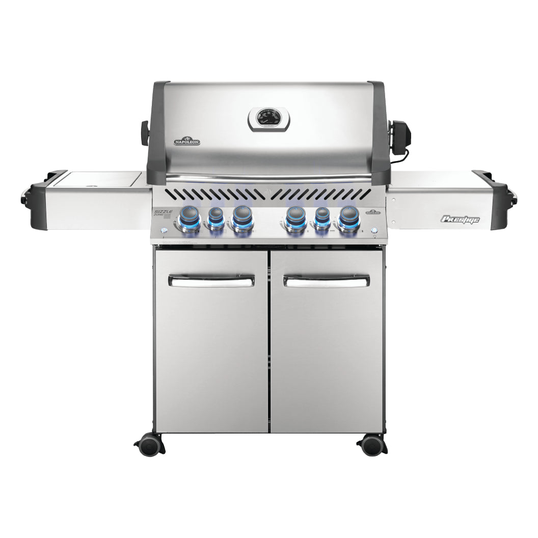 Le barbecue Napoleon Héritage Prestige® 500 au propane, en inox, offre 4 brûleurs principaux, un brûleur latéral et un infrarouge arrière, avec 8 modes de cuisson. Il peut cuire jusqu’à 30 burgers simultanément. Durable, facile d’entretien, il inclut des plaques de protection et une fonction SafetyGlow pour la sécurité.