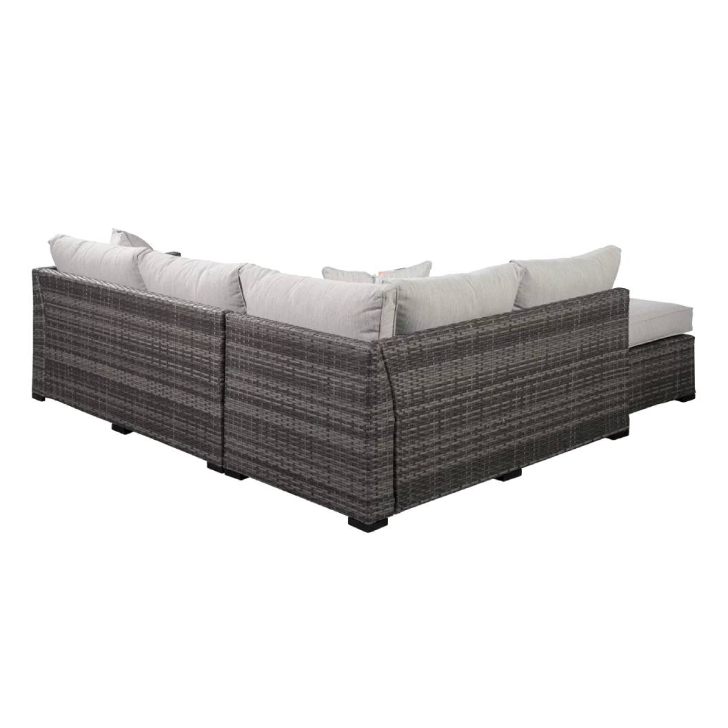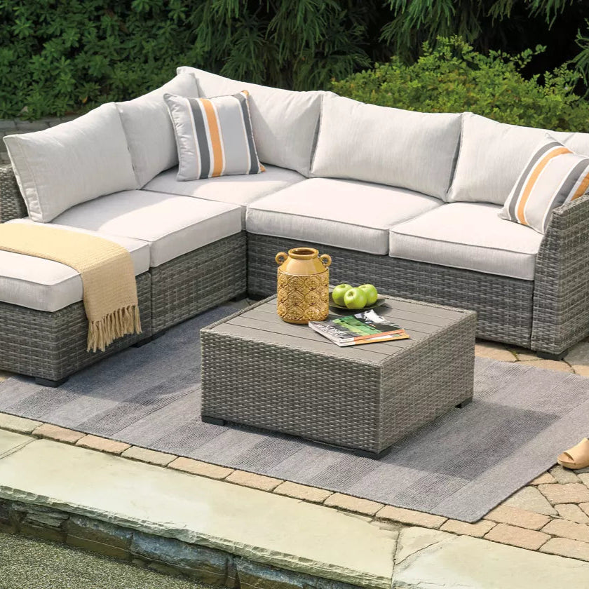 Conçu pour une vie en plein air sans tracas, cet ensemble quatre pièces comprend un sectionnel spacieux, une table de centre au fini bois naturel et deux coussins décoratifs, offrant un espace de détente convivial et élégant. Un choix idéal pour ceux qui recherchent le confort durable et le style contemporain, saison après saison.