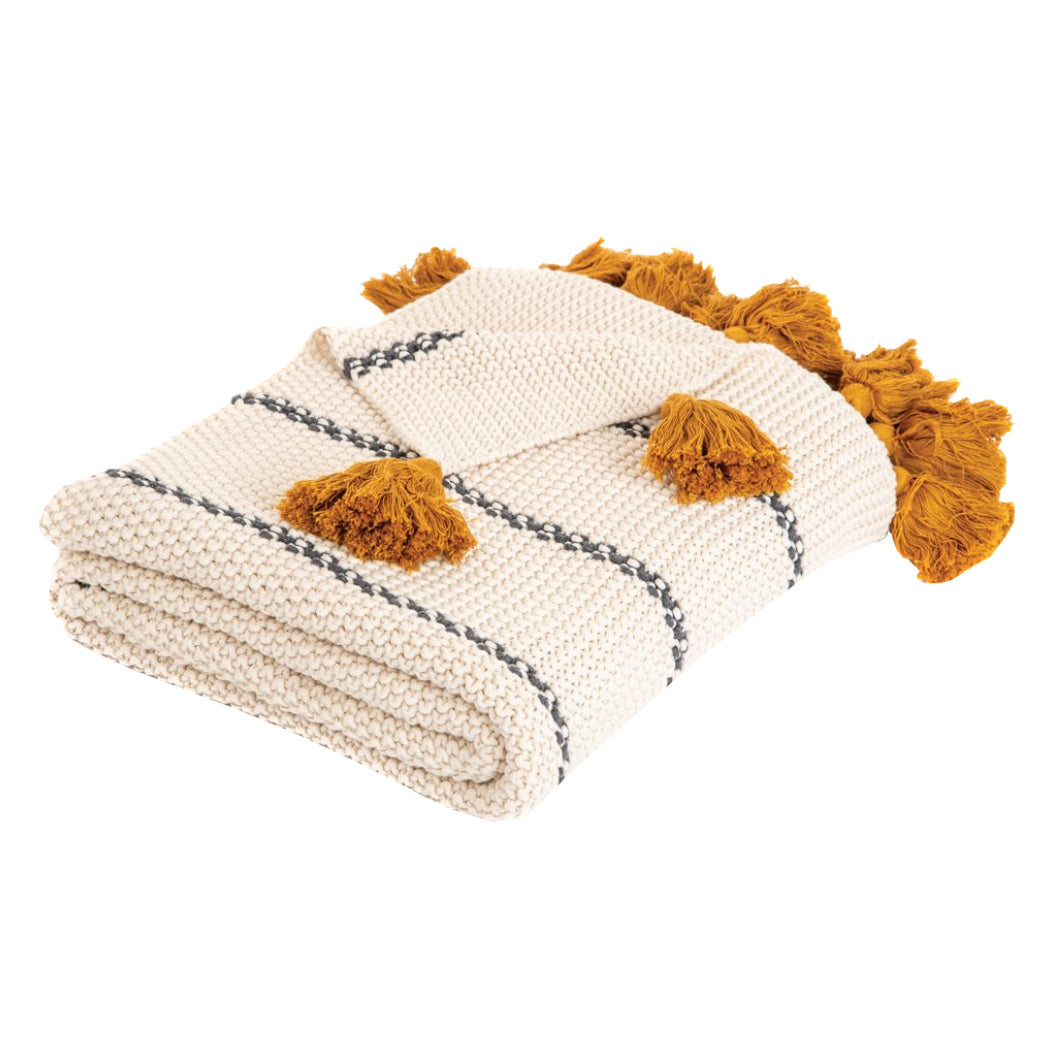 Les glands de couleur moutarde ajoutent une note chaleureuse et dynamique, faisant de ce jeté un incontournable pour rehausser n'importe quel espace. Fabriqué en 100% coton, il allie confort et esthétique, tout en étant pratique grâce à sa lavabilité en machine.