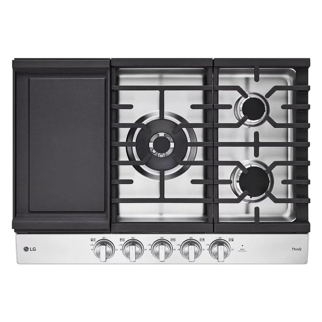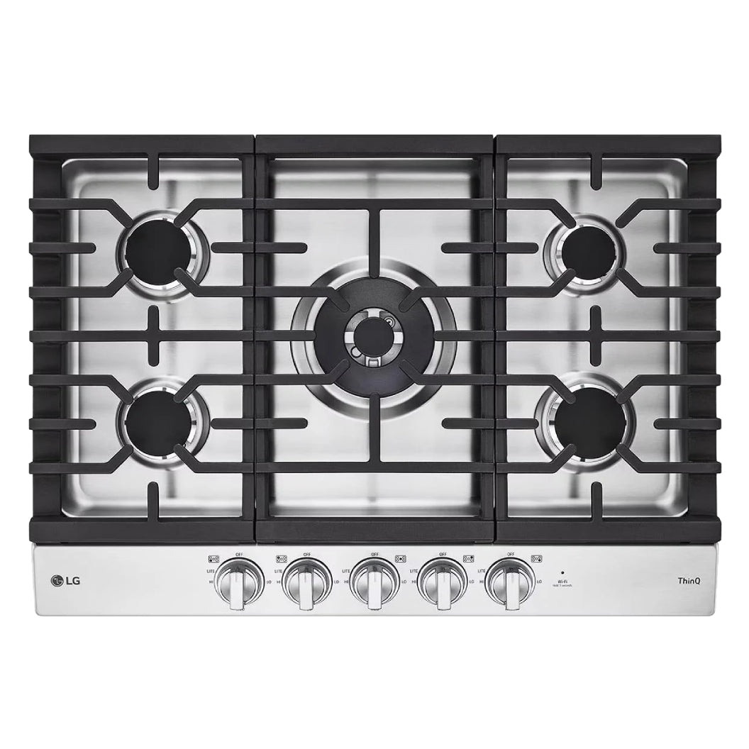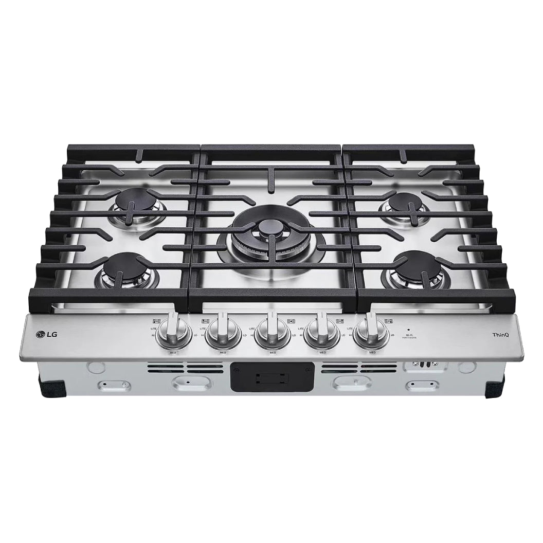 Les brûleurs de la table de cuisson se synchronisent avec votre hotte intelligente LG ou votre micro-ondes au-dessus de la cuisinière via l'application ThinQ® pour activer automatiquement les ventilateurs et les lumières pour une expérience de cuisson fluide.