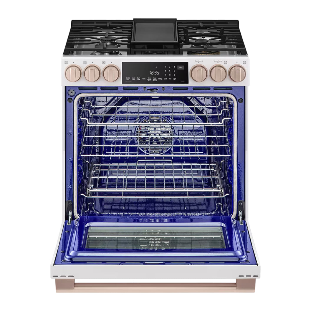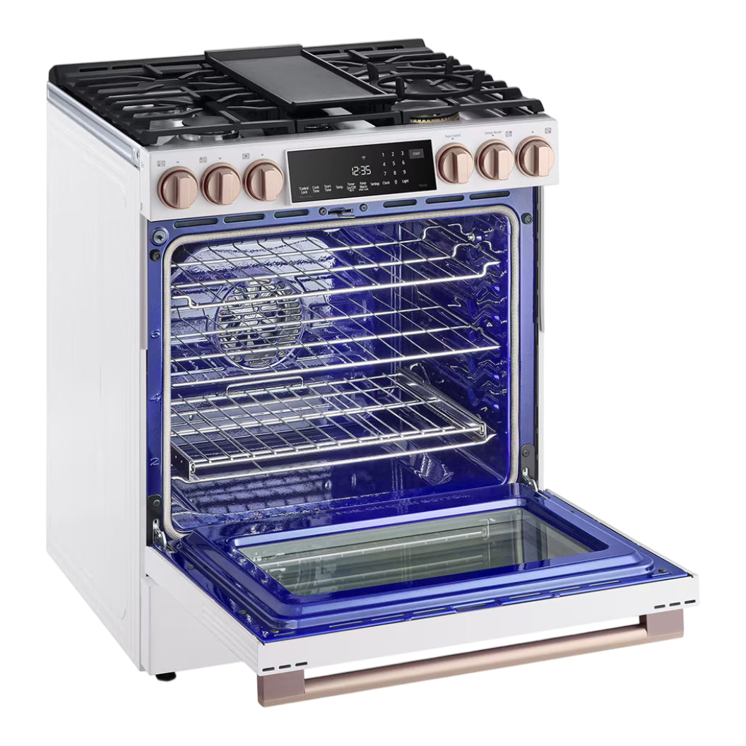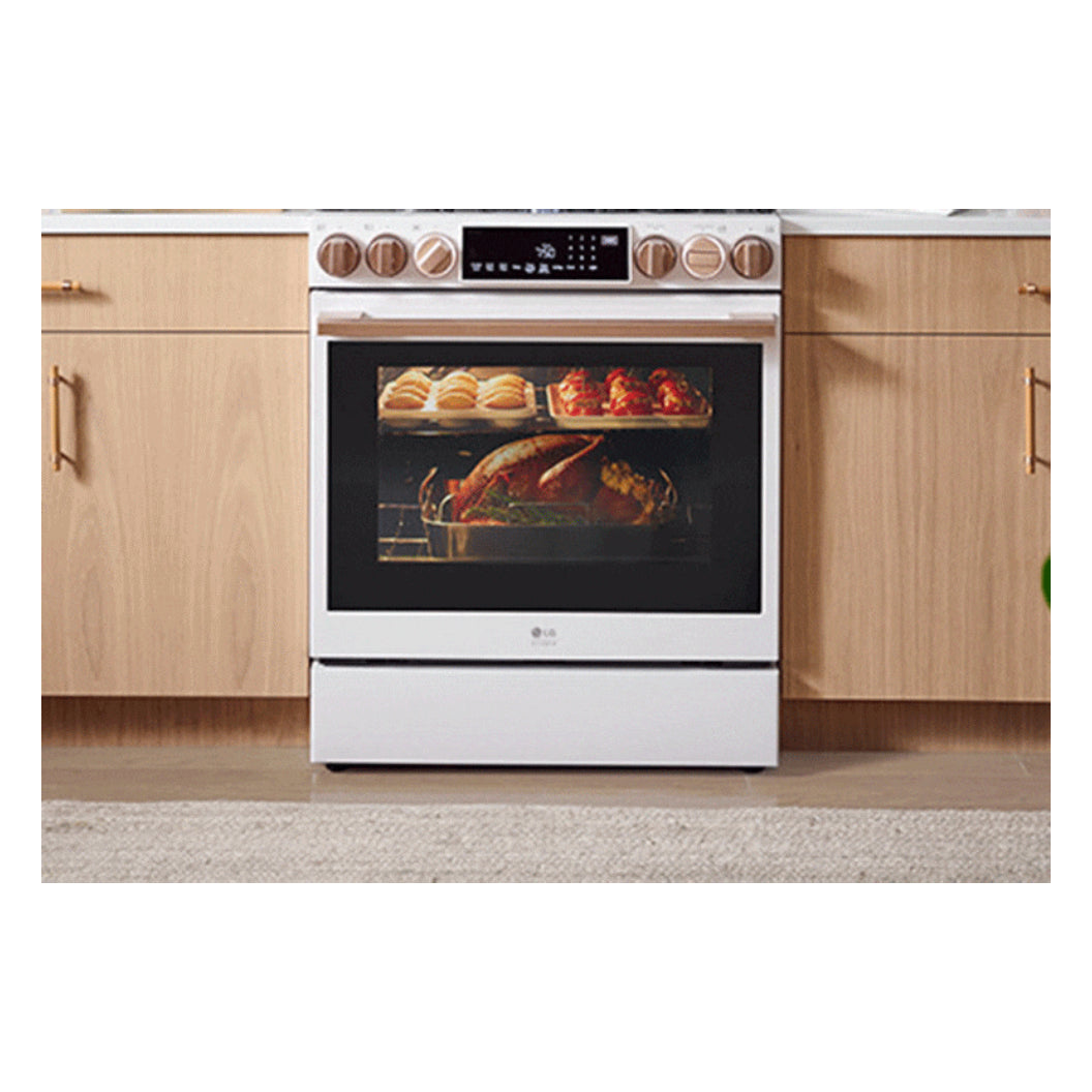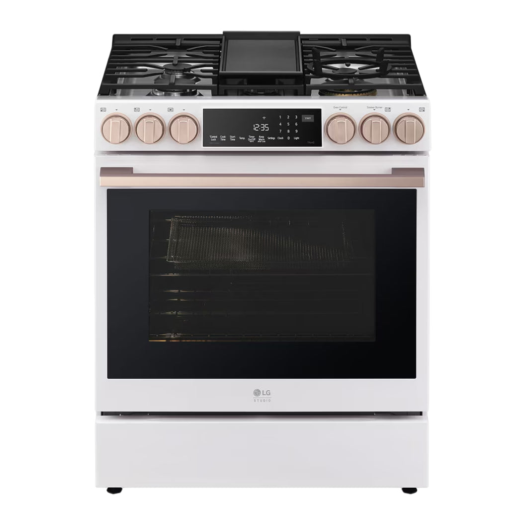 Le four encastrable à gaz LG STUDIO LSGS6338N se distingue par son design exclusif Essence White, apportant une touche raffinée et intemporelle à la cuisine. Sa capacité de 6,3 pi³ répond aux besoins des repas quotidiens comme des grandes réceptions. Grâce à la convection ProBake®, la chaleur est répartie uniformément pour des cuissons impeccables sur chaque grille. La fonction InstaView® permet de vérifier la cuisson d’un simple double tapotement sur la porte, sans perte de chaleur. Élégant, performant et pensé pour le confort, ce modèle allie style et efficacité.