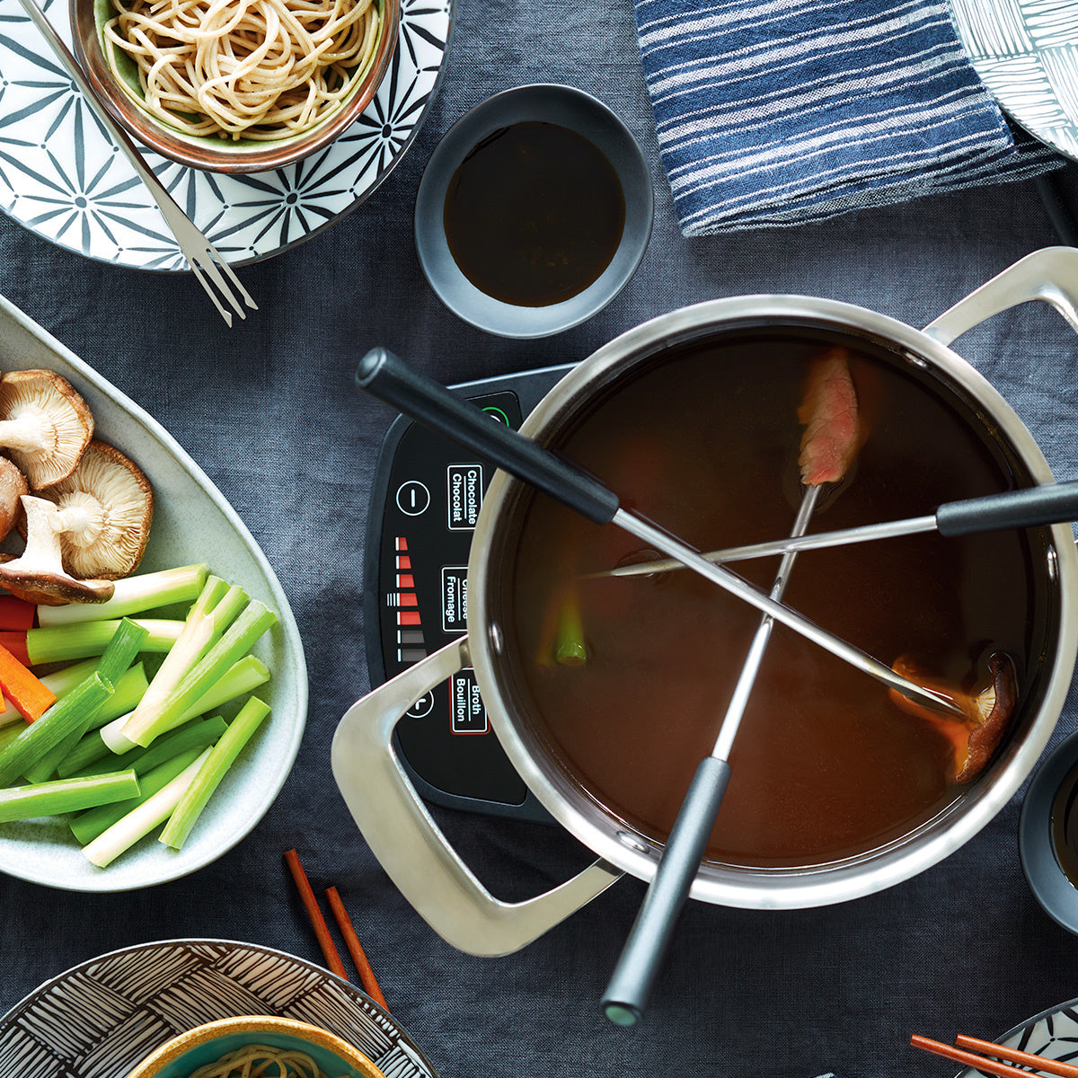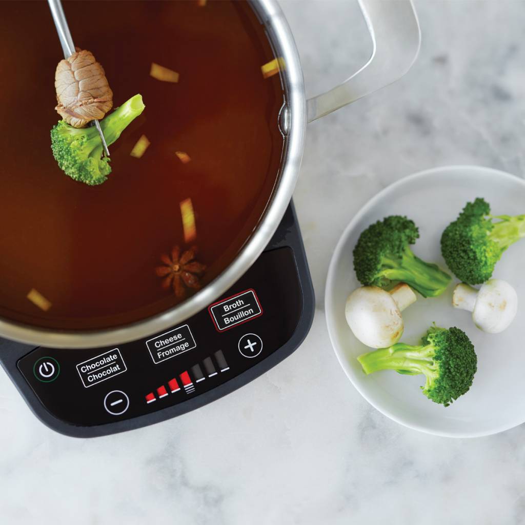 Doté de fonctions préprogrammées, il permet un contrôle précis de la température des bouillons, des fondues au fromage et des fondues au chocolat, et ce, tout au long du repas. À la fois pratique et sécuritaire, l’ensemble inclut huit fourchettes de différentes couleurs et un élégant support chromé au look contemporain.
