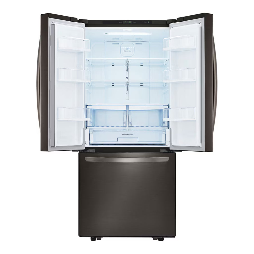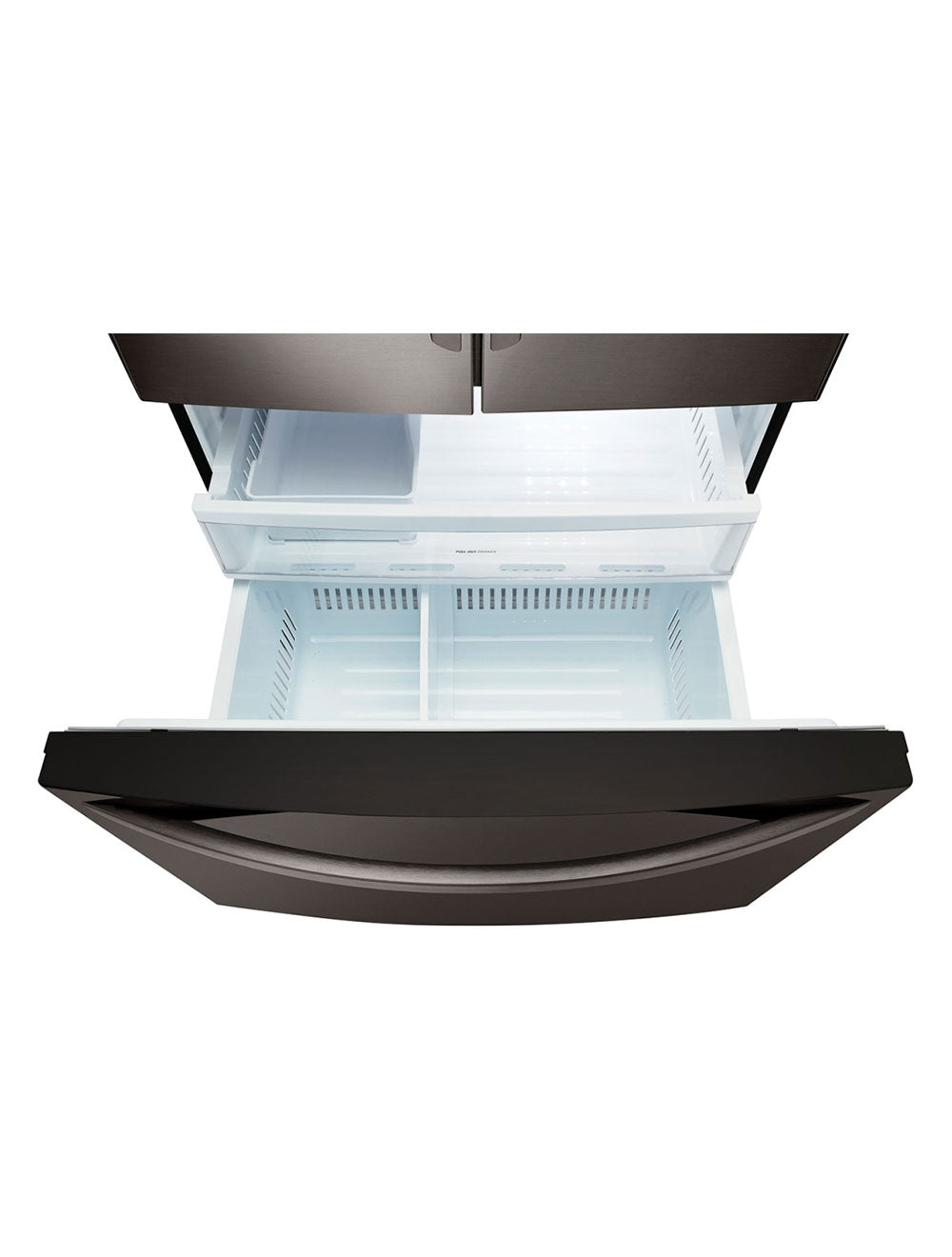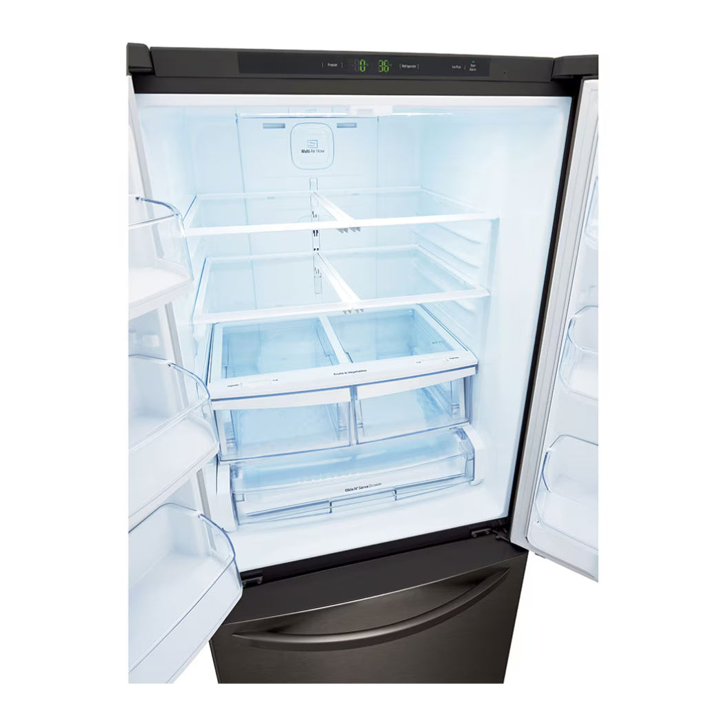 Le réfrigérateur à porte française LG LRFNS2200D de 21,8 pi³ combine élégance et fonctionnalité dans un design épuré en acier inoxydable noir résistant aux traces de doigts. Son format à trois portes optimise l’organisation tout en offrant un accès aisé aux aliments les plus utilisés. Grâce à son compresseur linéaire Inverter, il assure une conservation efficace avec un niveau sonore réduit. Ce modèle se distingue par sa conception pensée pour le quotidien, avec ses deux tiroirs à légumes, son large garde-manger pleine largeur et son congélateur à deux niveaux, le tout sans compromettre l’esthétique ni l'efficacité énergétique.