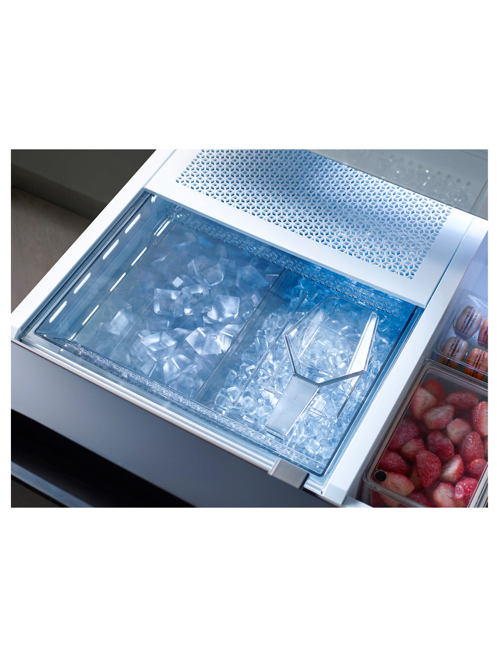 Assurez-vous d'être toujours prêt pour toutes les occasions avec deux types de glace différents. La machine à glaçons automatique double fabrique à la fois de la glace en cubes et des bouchées de glace, qui refroidissent les boissons beaucoup plus rapidement.
