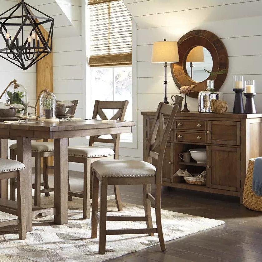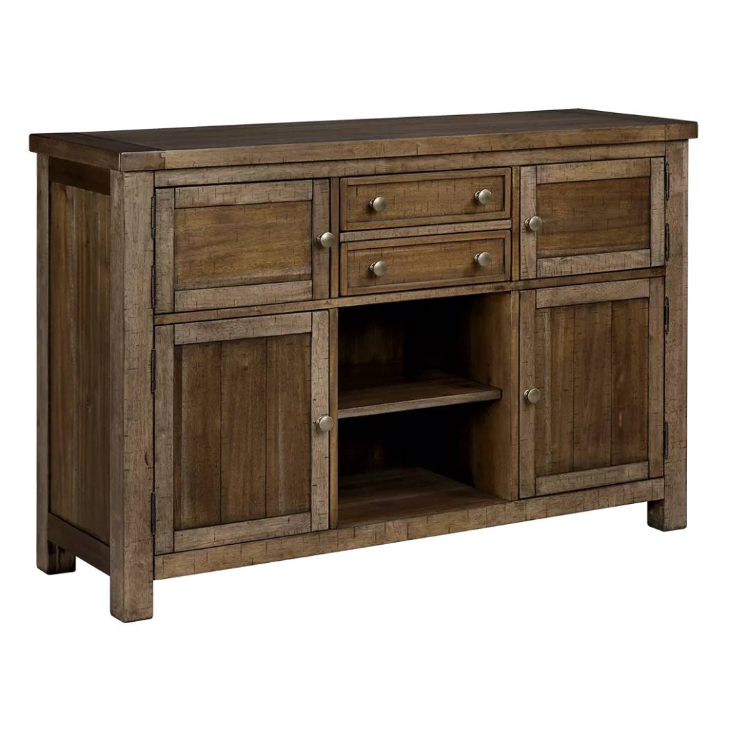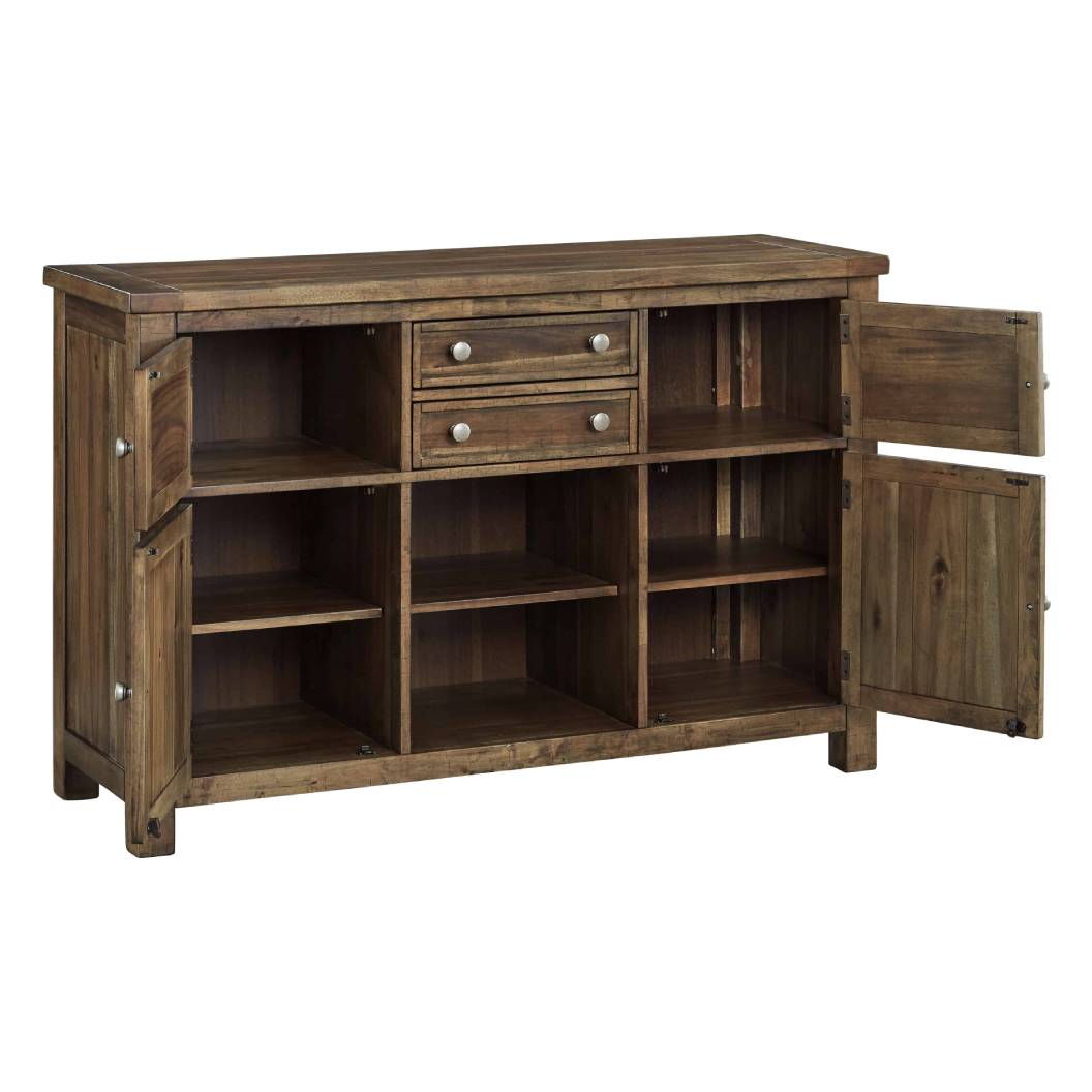 Le serveur Moriville D631-60 de Ashley séduit par son apparente simplicité, enrichie de détails raffinés qui révèlent tout son caractère. Sa finition noix de muscade vieillie, ses portes d’armoire et son plateau à effet planche confèrent à l’ensemble un charme chaleureux et authentique. Doté de deux tiroirs coulissants (dont un avec doublure en feutre), de quatre armoires avec étagères intérieures et d’un présentoir central ouvert, ce meuble offre une organisation fonctionnelle et élégante pour la salle à manger. Un choix intemporel conçu pour durer.