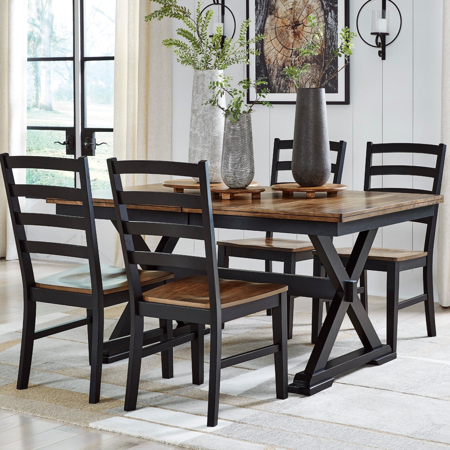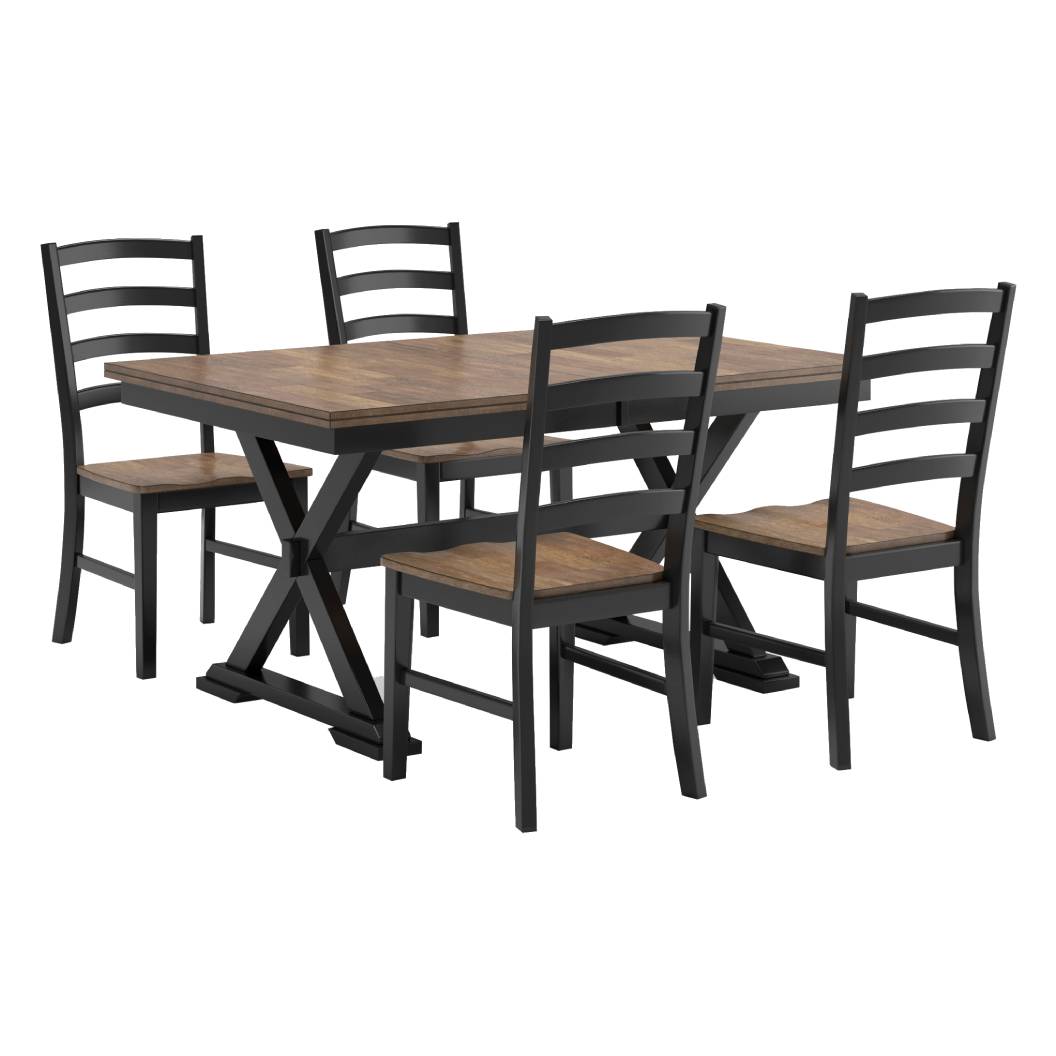 L'ensemble de salle à manger Wildenauer D634-35/01X4 de Ashley offre une interprétation contemporaine du style campagnard classique. Sa finition bicolore contrastée et son plateau façon bloc de boucher en placage de manguier créent une ambiance à la fois chaleureuse et sophistiquée. La table extensible permet d’accueillir jusqu’à huit convives grâce à une feuille de papillon auto-stockable ingénieuse. Les quatre chaises assorties, avec dossier en échelle et finition coordonnée, apportent confort et harmonie à l’ensemble.