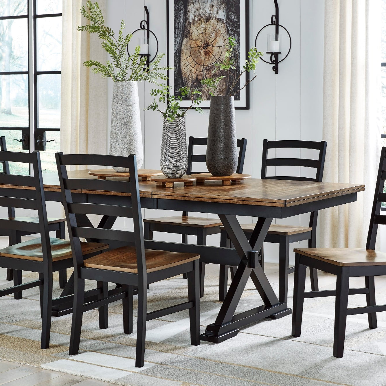 L'ensemble de salle à manger Wildenauer D634-35/01x6 de Ashley incarne à merveille l’esprit du style campagnard modernisé. Avec sa finition bicolore distinctive et son plateau en placage de bois de manguier façon bloc de boucher, la table offre un contraste visuel chaleureux et accueillant. Sa silhouette robuste et sa structure en bois massif lui confèrent une solidité remarquable, tout en évoquant l’authenticité des meubles rustiques. Les six chaises assorties, à dossier en échelle et assise profilée, complètent parfaitement l’ensemble avec une esthétique équilibrée entre tradition et modernité.