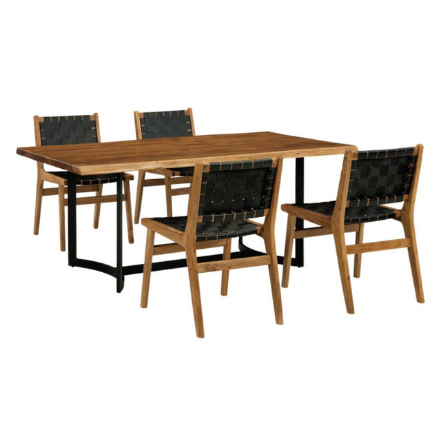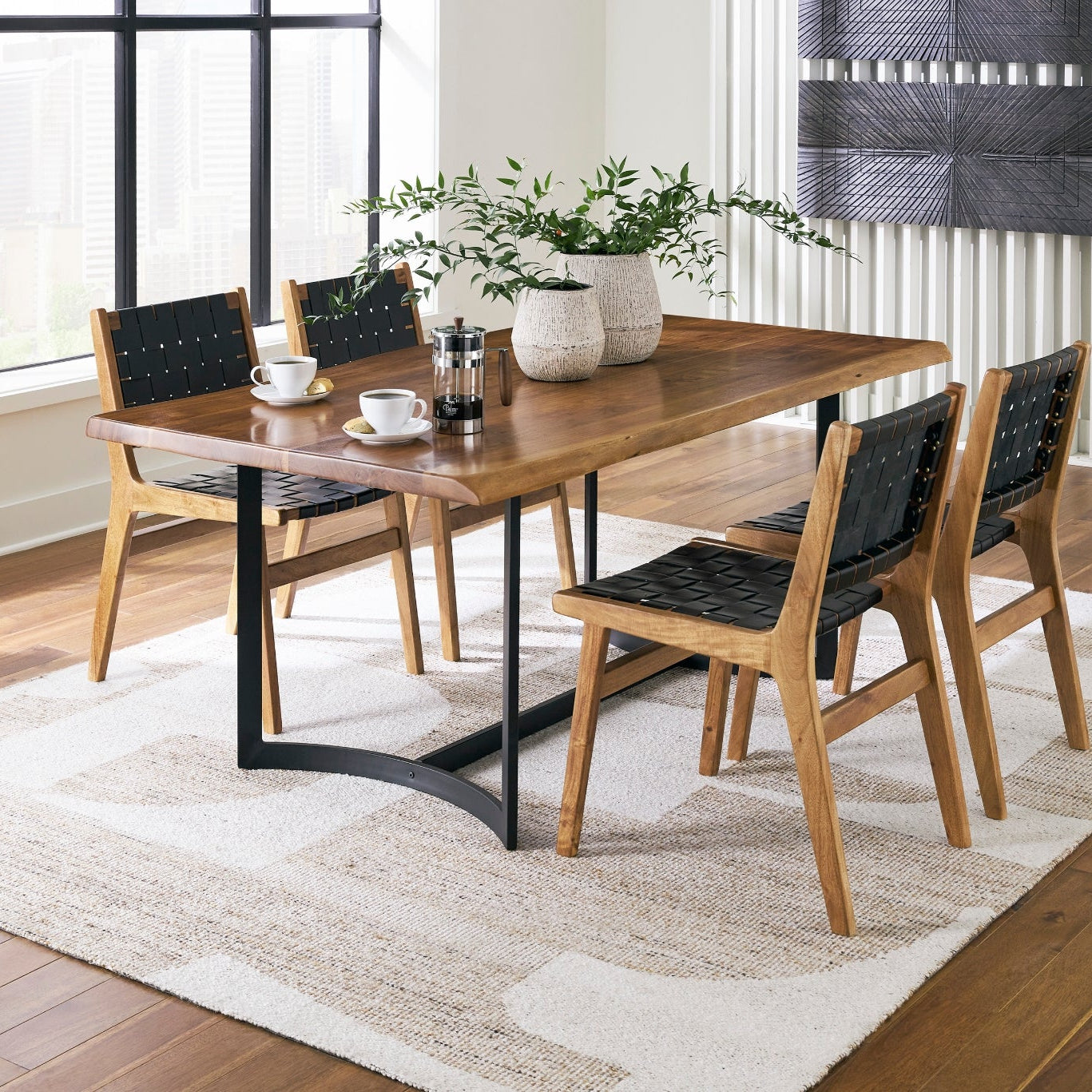 Équilibre parfait entre simplicité et raffinement, l'ensemble de salle à manger Fortmaine D872-25/01X4 de Ashley met à l’honneur le design minimaliste dans sa forme la plus élégante. Composé d’une table pouvant accueillir jusqu’à six personnes et de quatre chaises coordonnées, il séduit par sa finition bois clair et ses lignes naturelles. Le plateau en bois massif d’acacia, avec bord brut, confère un cachet authentique à l’ensemble, tandis que les chaises, aux sangles de cuir noir tressé et détails en laiton, apportent un contraste moderne.
