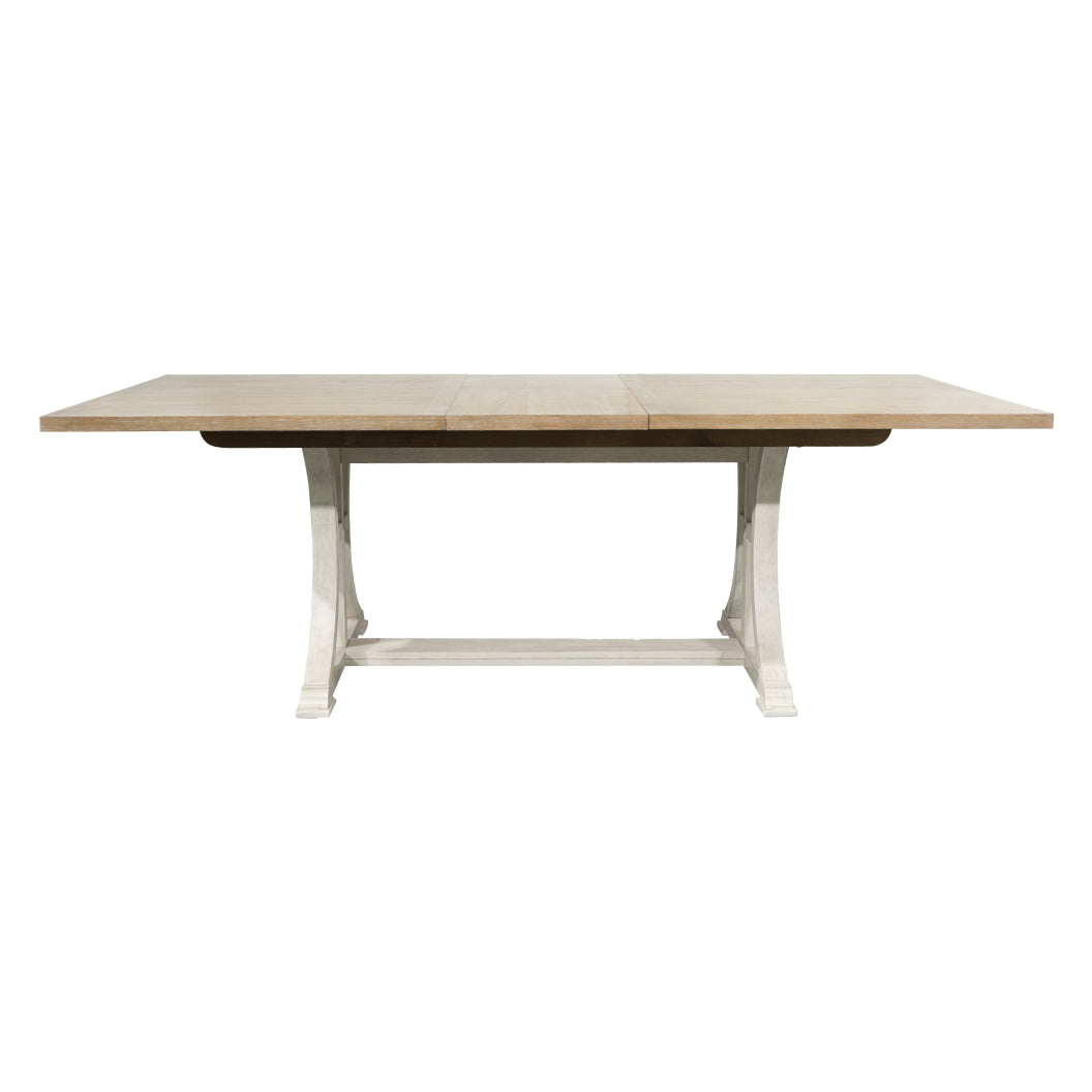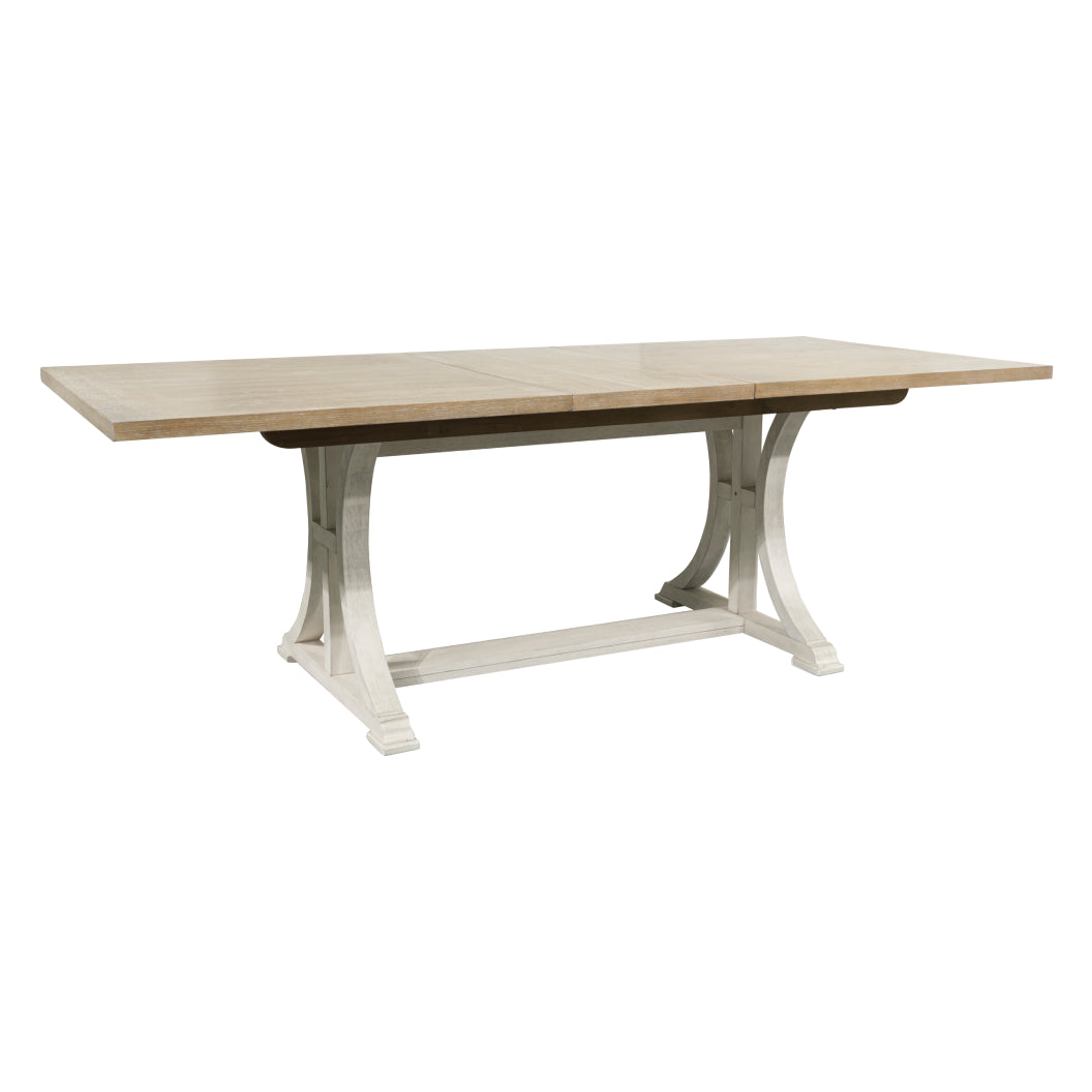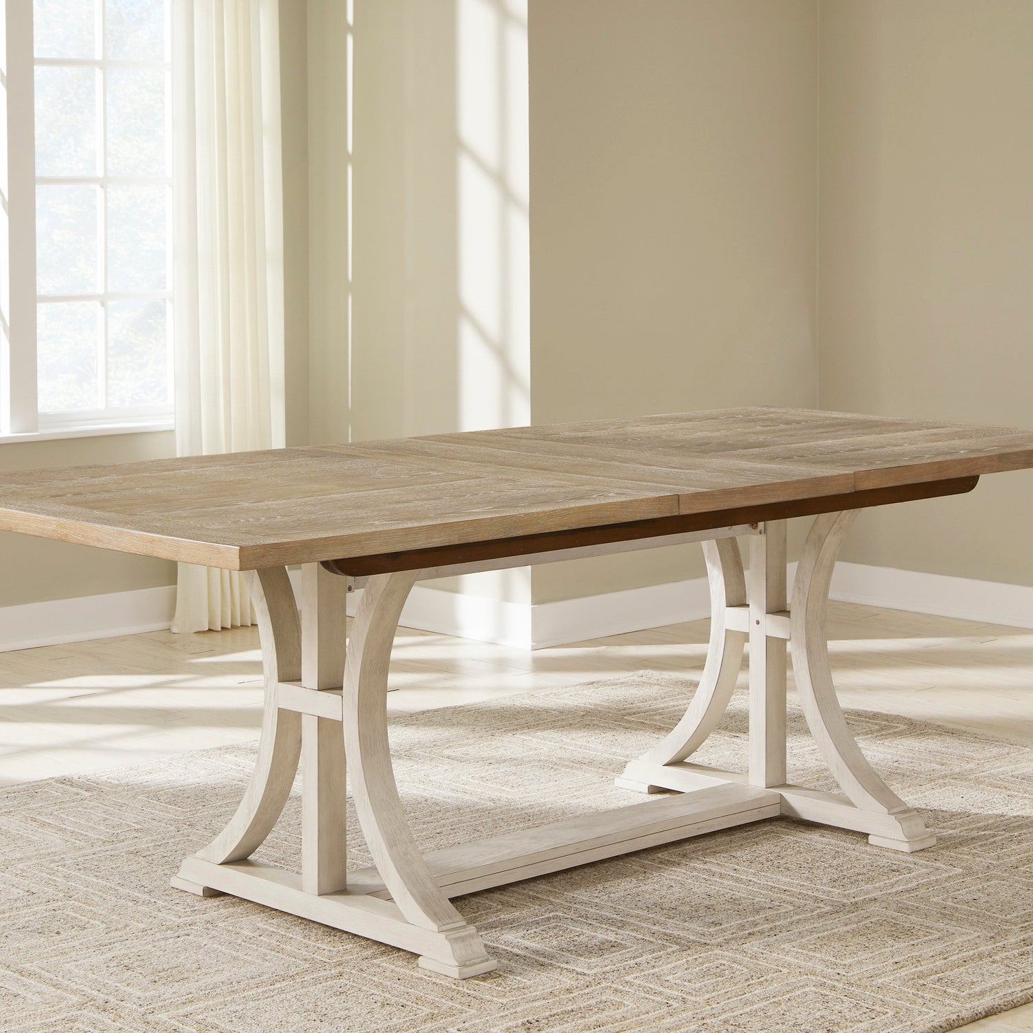 La table Shaybrock revisite le design de ferme avec une sophistication actuelle, mêlant chaleur et raffinement. Sa finition bicolore associe un blanc vieilli lumineux à un brun grisâtre clair, pour un rendu à la fois accueillant et tendance. Sa base à double tréteau apporte une présence visuelle équilibrée, tout en soulignant l’inspiration artisanale du meuble. Grâce à sa rallonge centrale amovible, cette table s’adapte aisément aux repas de tous les jours comme aux grandes occasions, pouvant accueillir jusqu’à huit personnes dans une ambiance conviviale.
