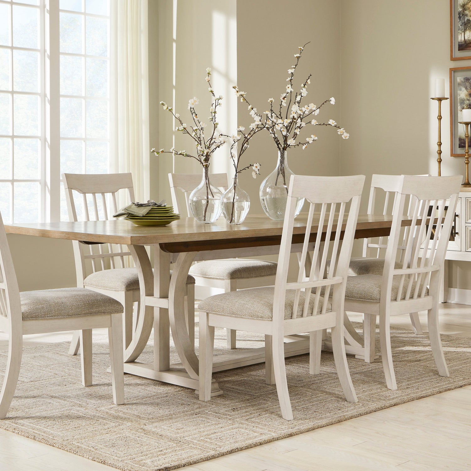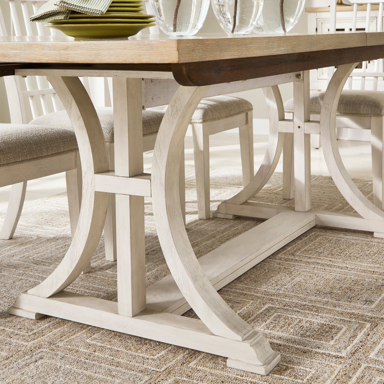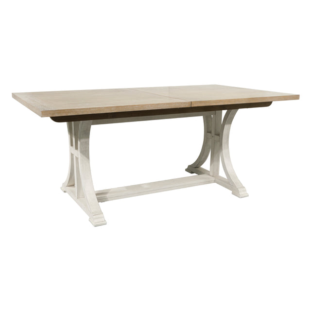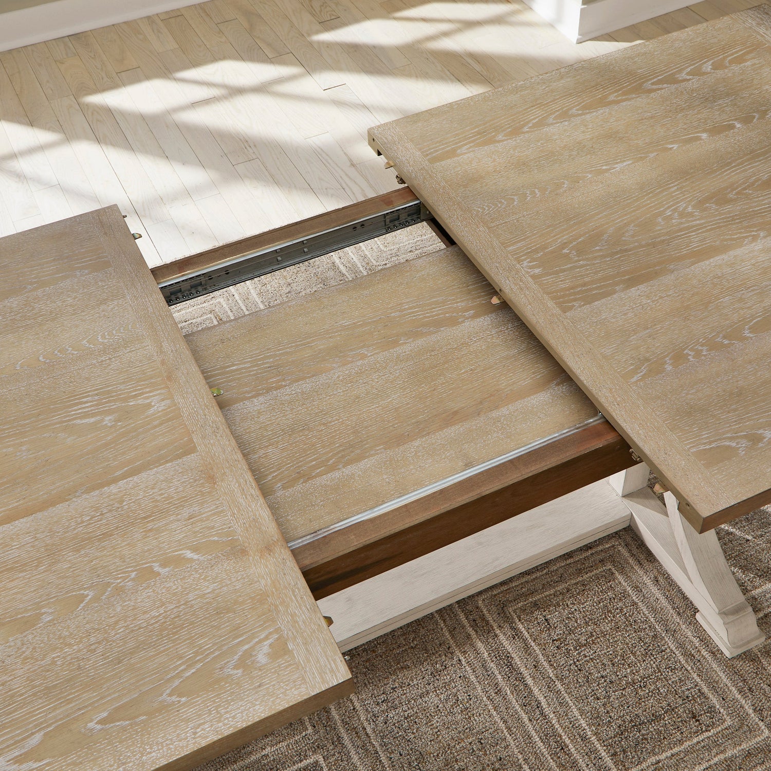 La table Shaybrock revisite le design de ferme avec une sophistication actuelle, mêlant chaleur et raffinement. Sa finition bicolore associe un blanc vieilli lumineux à un brun grisâtre clair, pour un rendu à la fois accueillant et tendance. Sa base à double tréteau apporte une présence visuelle équilibrée, tout en soulignant l’inspiration artisanale du meuble. Grâce à sa rallonge centrale amovible, cette table s’adapte aisément aux repas de tous les jours comme aux grandes occasions, pouvant accueillir jusqu’à huit personnes dans une ambiance conviviale.