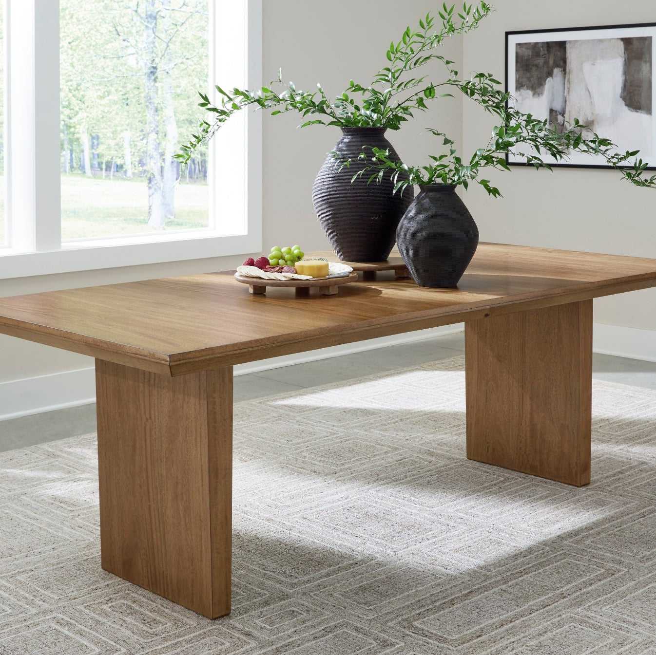 Pensée pour les amateurs de lignes pures et d’esthétique contemporaine, la table Sherbana D833-35 de Ashley allie sobriété élégante et fonctionnalité. Son plateau épais à profil biseauté repose sur une base à double plinthe, créant une silhouette équilibrée et structurée. La rallonge centrale amovible permet d’adapter facilement la surface de repas selon les besoins, jusqu’à huit convives.
