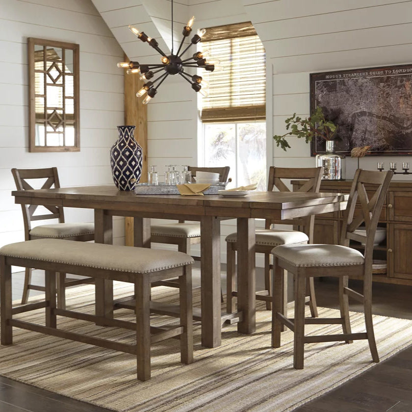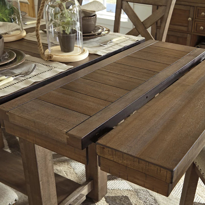 Sous son apparente simplicité, la table à hauteur de comptoir Moriville D631-32 de Ashley révèle un design riche en détails. Son plateau effet planche et sa finition noix de muscade vieillie lui confèrent une allure chaleureuse et intemporelle, tandis que sa base à tenons apporte une touche artisanale subtile. Parfaitement adaptée aux espaces de type loft ou aux cuisines compactes, cette table sait aussi se transformer grâce à ses deux rallonges séparées, permettant d’accueillir jusqu’à huit personnes en toute convivialité.