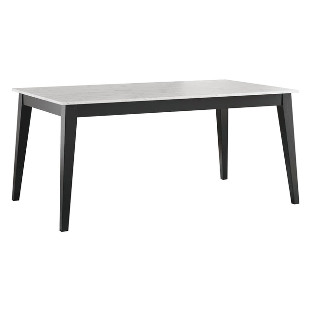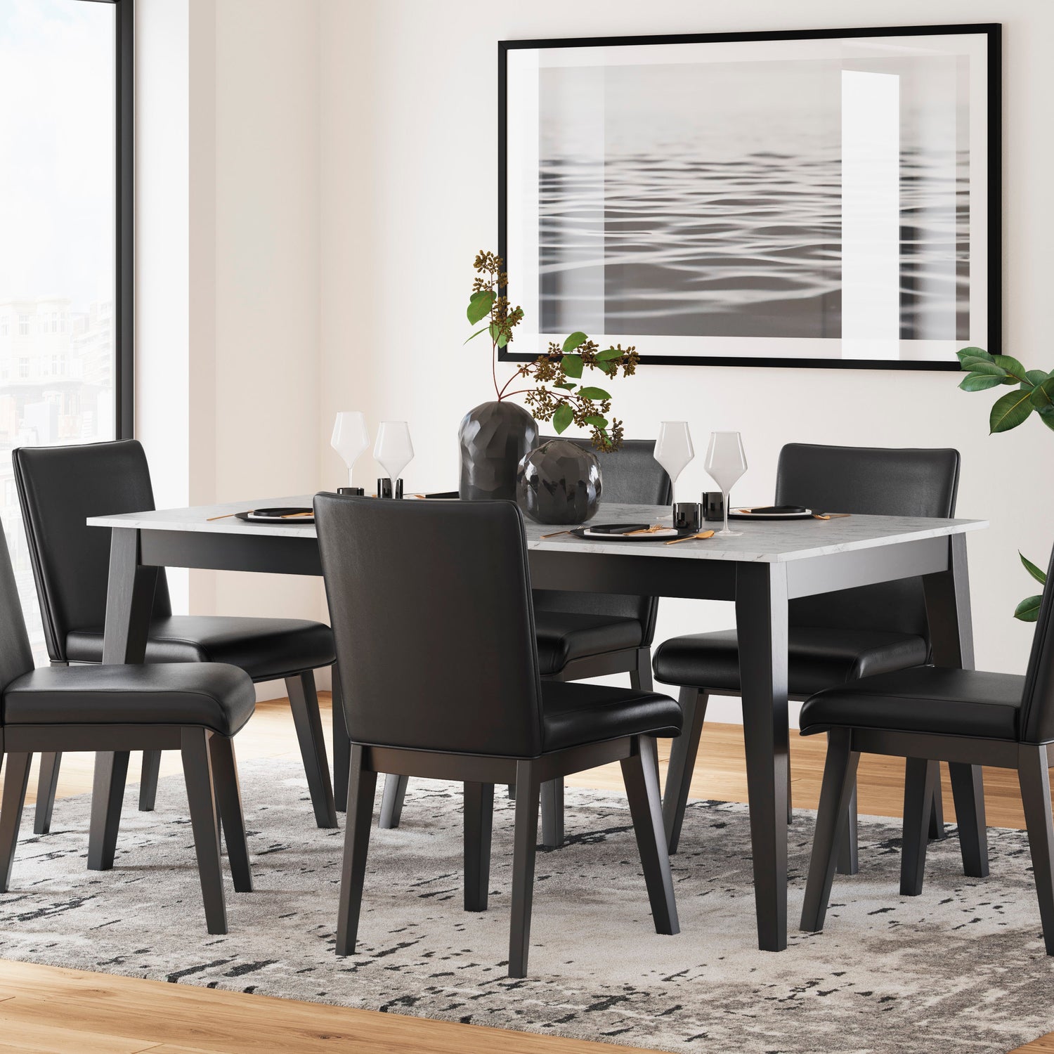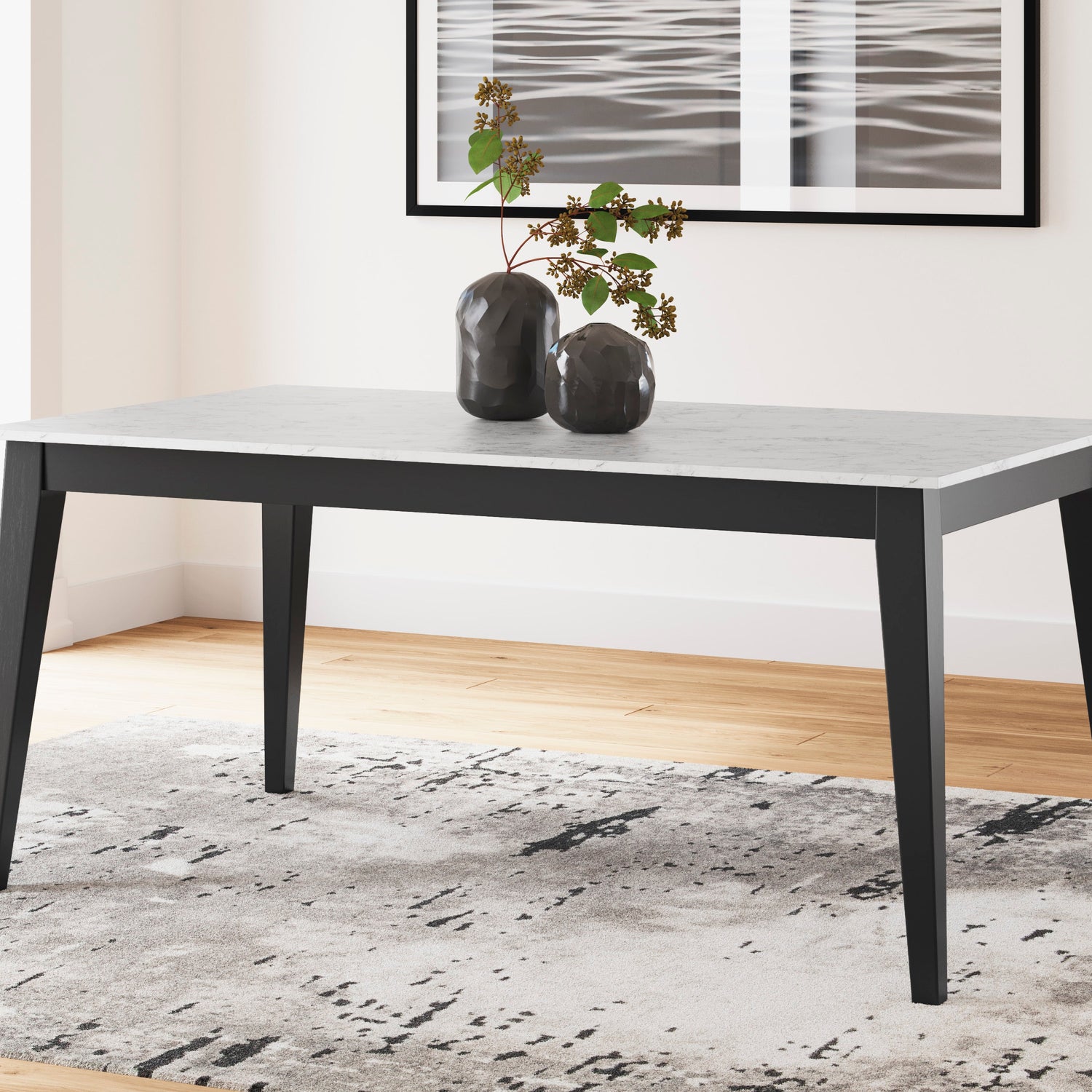 La table à manger Jettaya D494-25 de Ashley incarne une sophistication contemporaine avec un contraste saisissant entre des matériaux nobles et des lignes affirmées. Son plateau en faux marbre blanc attire le regard par sa finition lumineuse et haut de gamme, tandis que sa base en bois noir profond, dotée de pieds épais et fuselés, lui confère stabilité et allure.