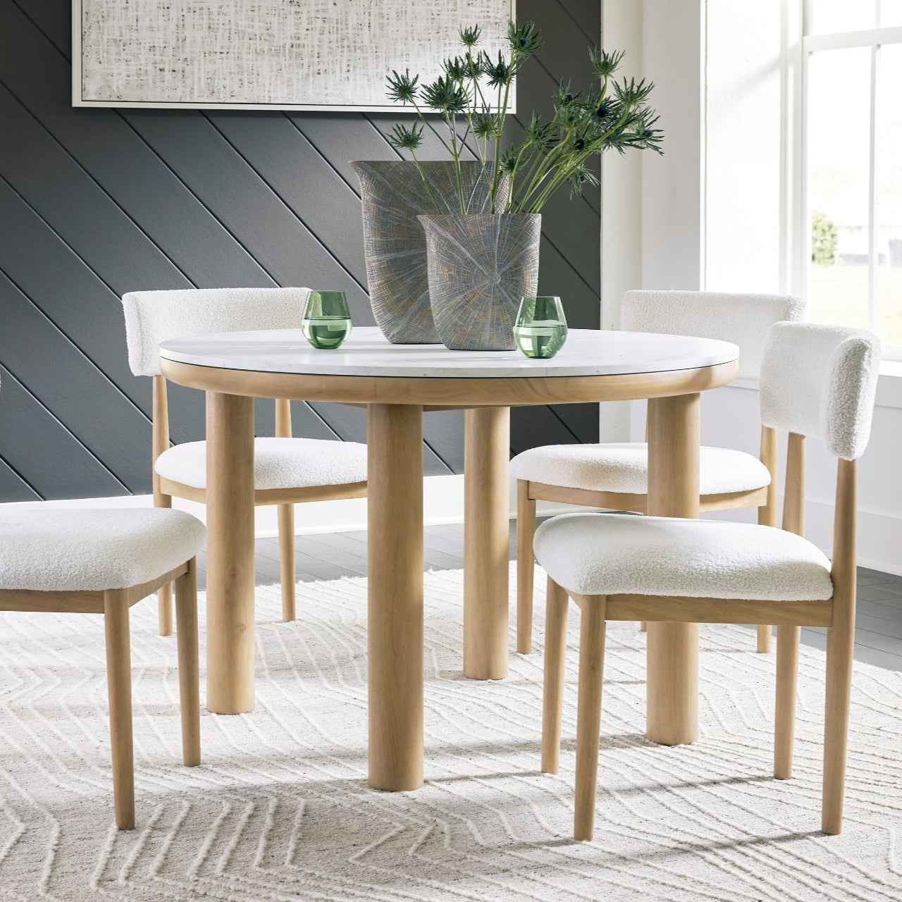 Cette table à manger Sawdyn D427-15 de Ashley allie lignes épurées et courbes audacieuses pour un rendu contemporain tout en douceur. Sa base composée de pieds ronds et épais, dans une finition bois naturel chaleureuse, crée un équilibre visuel apaisant et structuré. Surmontée d’un plateau en marbre blanc répliqué, elle apporte une touche lumineuse et raffinée à votre espace repas.