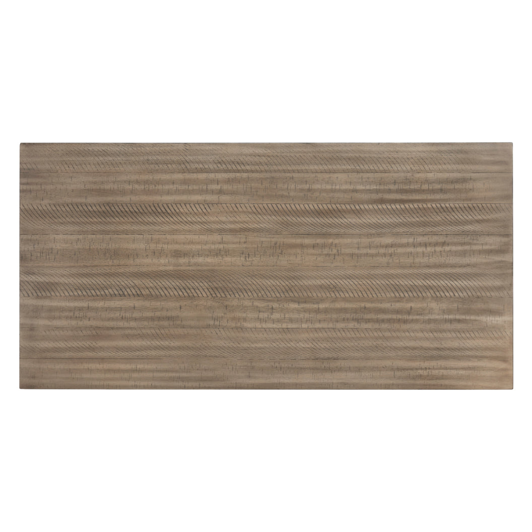Plateau marron effet planches associé à une base blanc grisâtre au fini frotté pour un look farmhouse raffiné. -