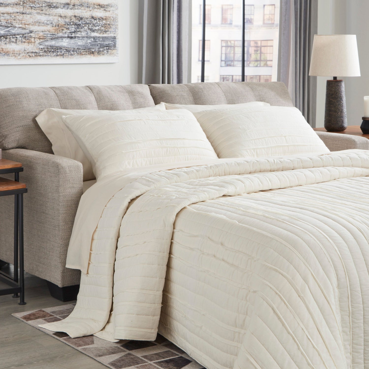 2 coussins 20" x 20" en polyfill doux ajoutent du style et du confort à l’ensemble.