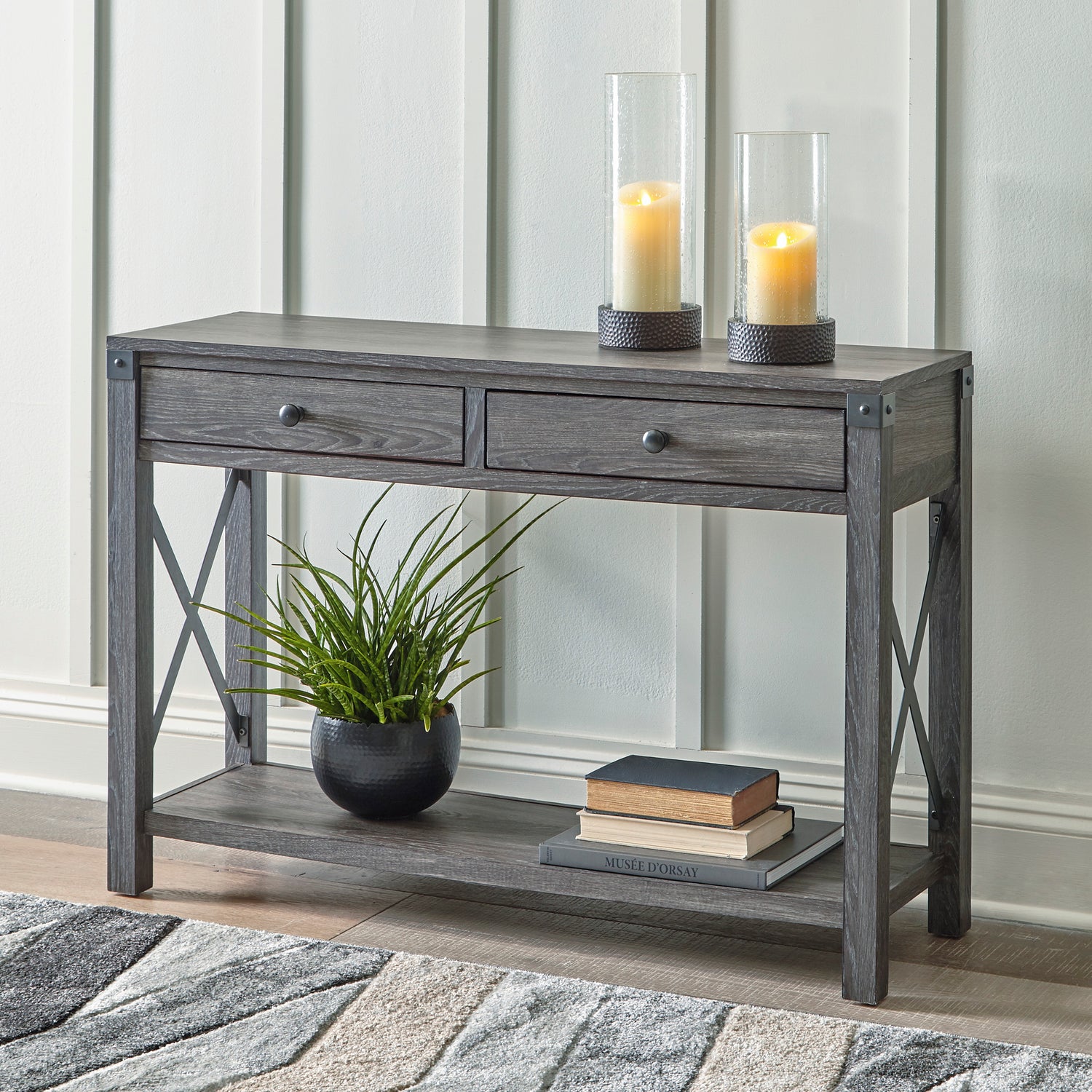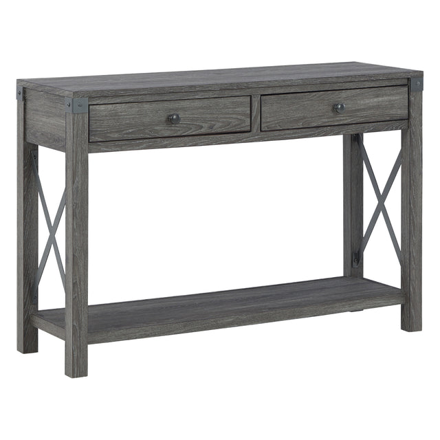 La table console Freedan T175-4 de Ashley incarne le style campagnard moderne avec élégance. Son aspect de grain de bois gris apporte une touche chaleureuse et contemporaine, tandis que les accents en métal en forme de croix ajoutent un détail visuel tendance. Pratique et esthétique, cette console offre deux tiroirs coulissants pour ranger les essentiels du quotidien ainsi qu’une étagère inférieure pour mettre en valeur vos accessoires décoratifs.