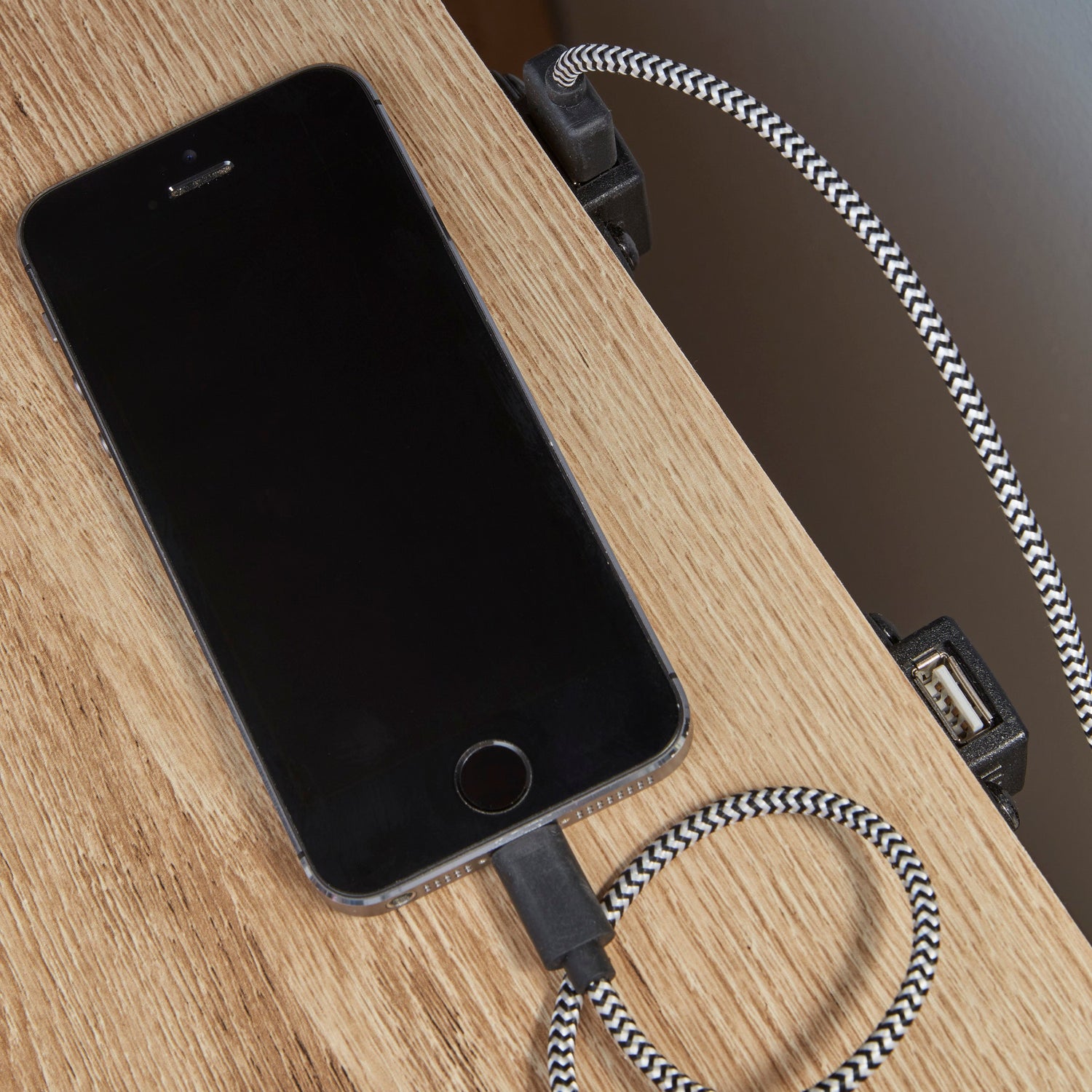 Deux ports USB discrets, intégrés sur le dessus, permettent de recharger facilement vos appareils électroniques sans encombrer l’espace. Un cordon d’alimentation est inclus pour une installation rapide et fonctionnelle.
