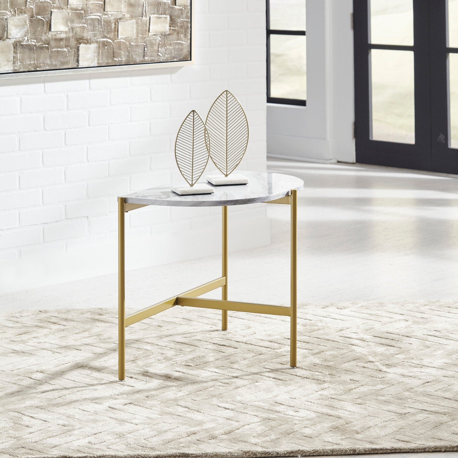 La table d'appoint Wynora T192-7 de Ashley se distingue par sa silhouette en demi-lune et son style résolument moderne. Parfaite pour rehausser un salon ou une chambre à coucher, elle marie des matériaux élégants avec une forme originale. Le dessus et l’étagère en faux marbre blanc ajoutent une note sophistiquée, tandis que la structure en métal doré illumine visuellement l’espace. Élégante sans être ostentatoire, cette table apporte une finition raffinée à tout décor contemporain.