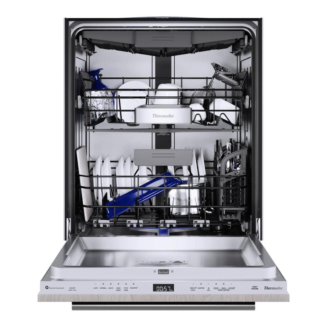 Le lave-vaisselle encastrable Thermador DWHD660EPR offre une performance de nettoyage supérieure grâce à ses fonctionnalités avancées. Conçu pour accueillir un panneau personnalisé, il s'intègre harmonieusement à tout style de cuisine. Doté d'un niveau sonore de 44 dBA, il assure un fonctionnement silencieux, idéal pour les cuisines ouvertes. Son troisième panier Chef’s Tool Drawer® offre une flexibilité accrue pour le rangement des ustensiles et des articles difficiles à placer.