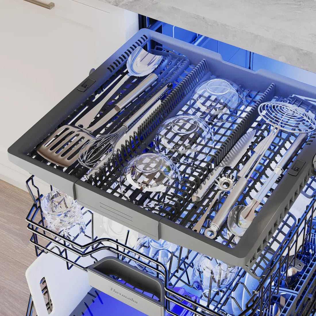 Ce troisième panier offre une flexibilité accrue pour le rangement des ustensiles, des couverts et des articles difficiles à placer, optimisant ainsi l'espace de chargement et améliorant l'efficacité du nettoyage. -
