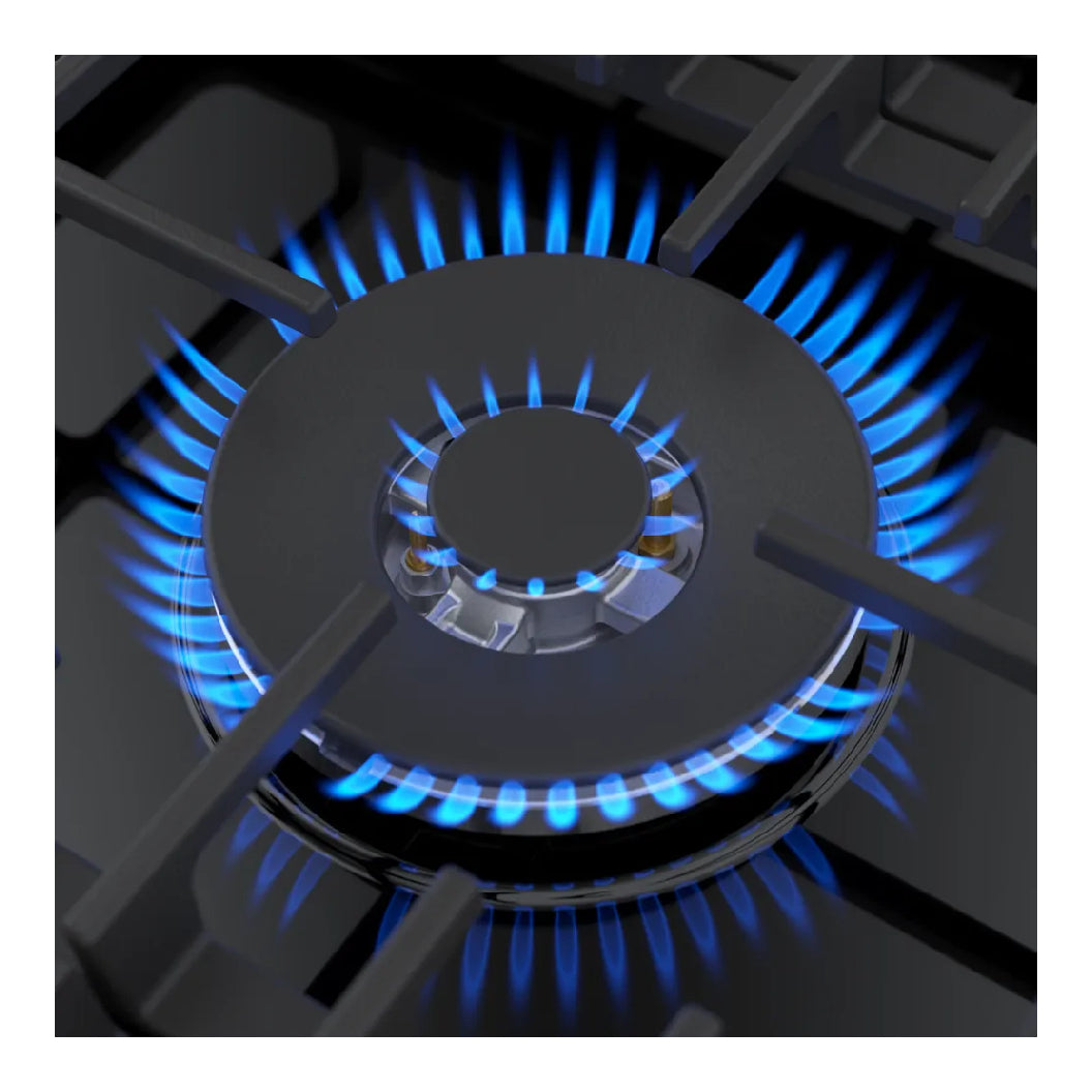 La table de cuisson au gaz Série 800 de Bosch NGM8049UC se distingue par sa précision et sa fiabilité. Grâce à la technologie FlameSelect®, elle offre 9 niveaux de puissance clairement définis pour garantir des résultats constants, que ce soit pour saisir rapidement ou mijoter délicatement. Le brûleur double anneau permet une polyvalence optimale, allant de la cuisson à feu doux jusqu’au feu vif pour saisir. Son design en émail noir avec boutons en acier inoxydable noir apporte une touche élégante et moderne à la cuisine, tout en offrant une utilisation intuitive avec un éclairage DEL indiquant le fonctionnement et la chaleur résiduelle.