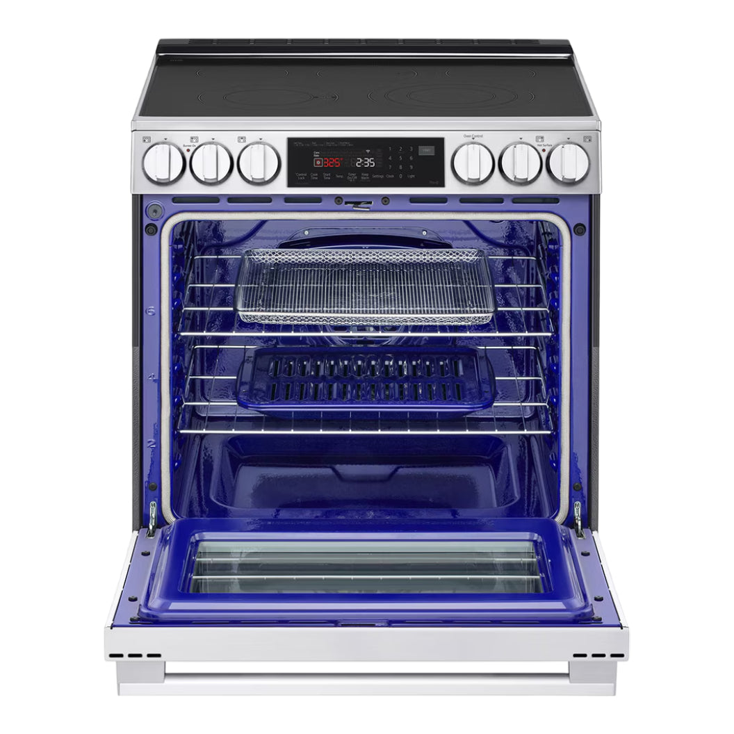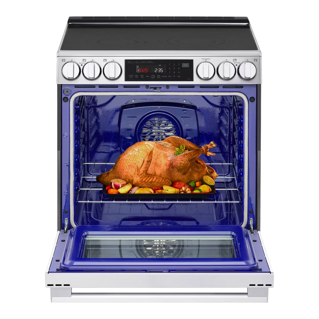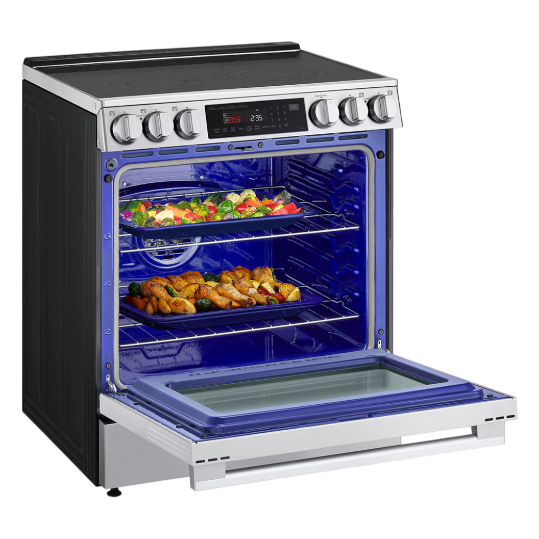 La cuisinière électrique encastrable LSEL6335XE de LG se distingue par sa technologie ProBake Convection® inspirée des cuisinières professionnelles. Sa grande capacité de 6,3 pi³ permet de préparer facilement des repas volumineux, tandis que la fenêtre InstaView® permet de vérifier la cuisson d’un simple double-tapotement, sans perdre de chaleur. Dotée de fonctions modernes comme la friture à l’air intégrée, l’élément 3-en-1 ultra-flexible et le nettoyage EasyClean®, cette cuisinière répond aux exigences des cuisiniers les plus méticuleux. Sa finition inox PrintProof™ et sa connectivité intelligente ThinQ® renforcent encore son attrait pour les cuisines connectées et performantes.